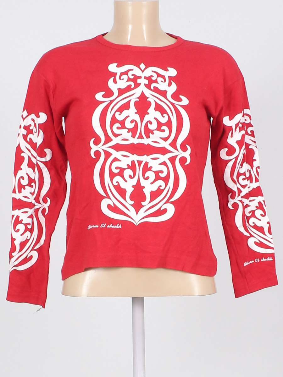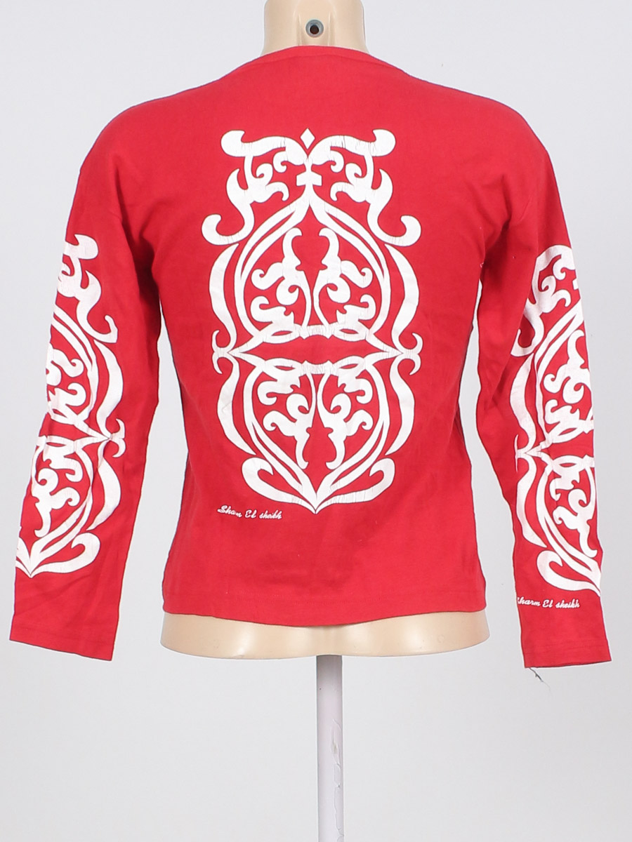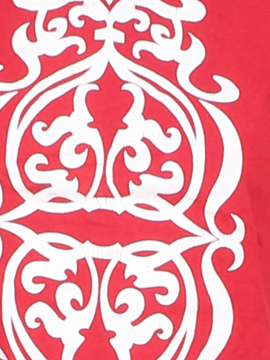Красный/белый. Есть катышки, загрязнения, потрескалось покрытие рисунка, местами растянуты и распускаются строчки по шву, лоснится ткань.