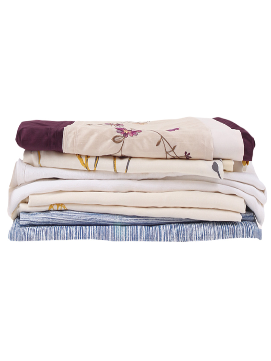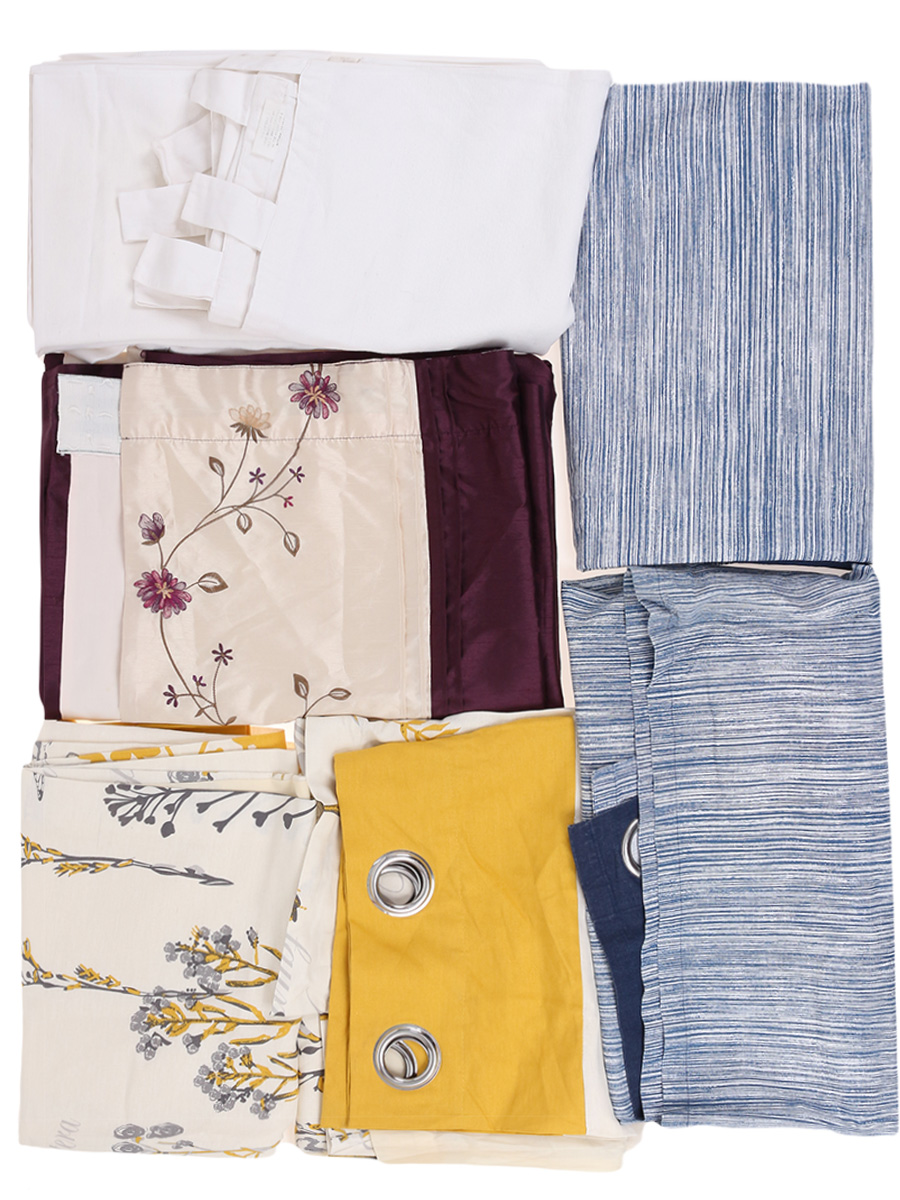 В комплекте синии шторы - 2 шт,, жёлтые шторы - 2 шт,, белые шторы - 2 шт., фиолетовая штора - 1 шт. Местами выцвела пятна.