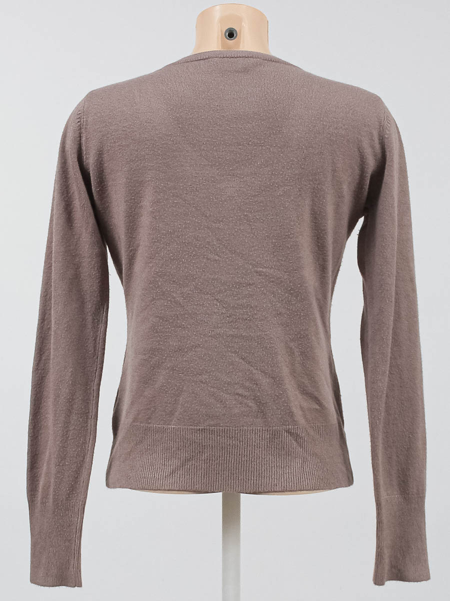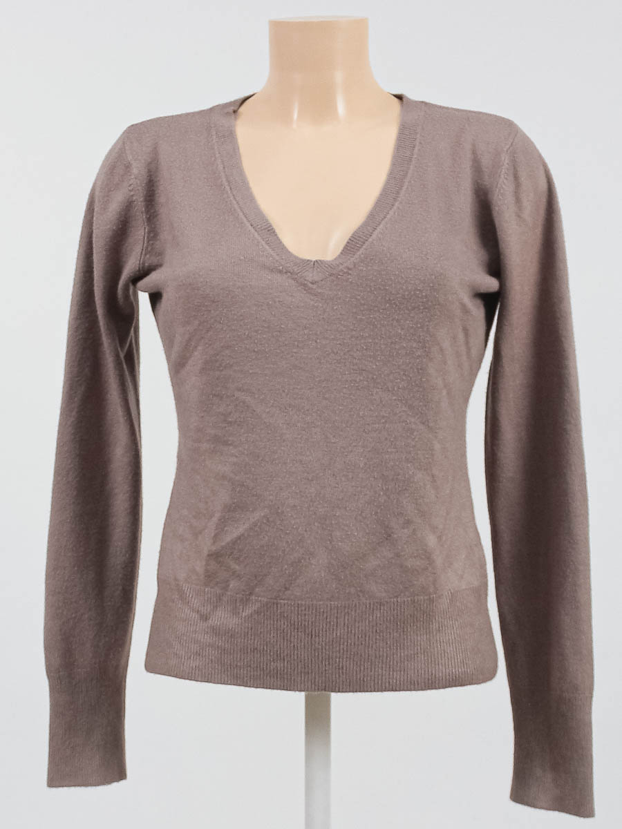 Серо-коричневый. Есть катышки, ткань лоснится, местами вытянулась.