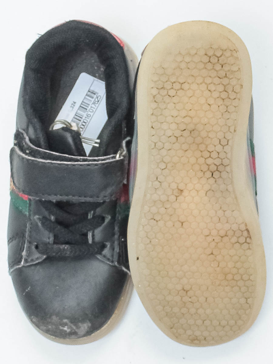 Маркировка на изделии отсутствует. Размер указан на основании замеров. Загрязнения, износ подошвы, потертости, повреждения материала, царапины.