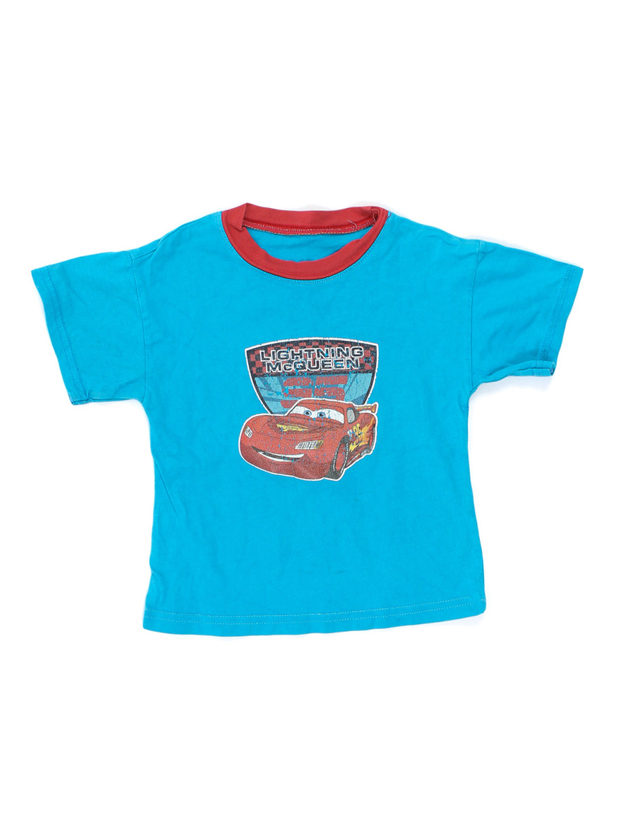 Ткань немного вытянулась и выцвела, катышки. Краска рисунка потрескалась. Маркировка на изделии отсутствует. Возраст указан на основании замеров.