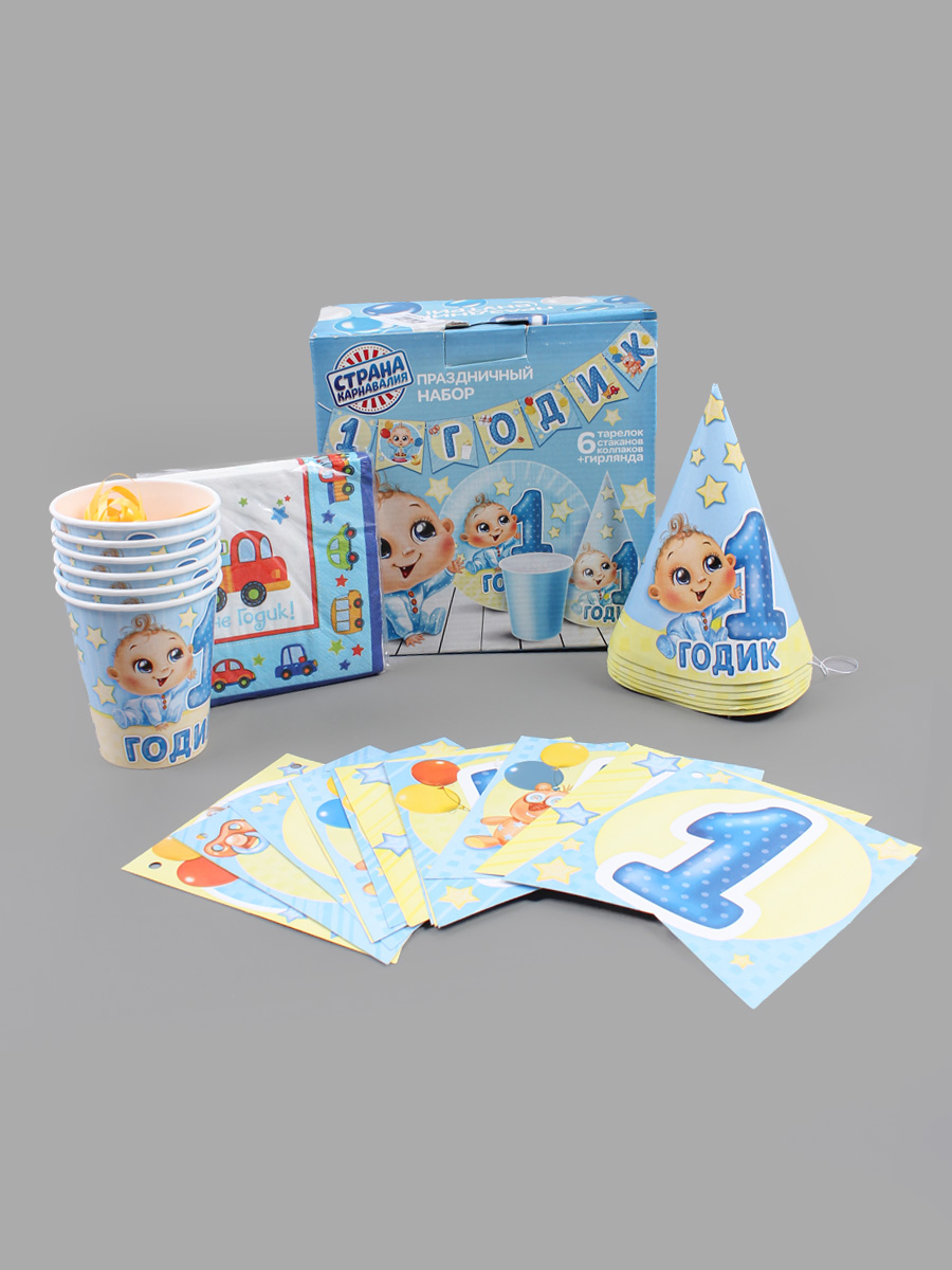В комплекте 6 колпаков, 6 стаканов, салфетки, гирлянда. Указаны замеры упаковки. Немного помята коробка.