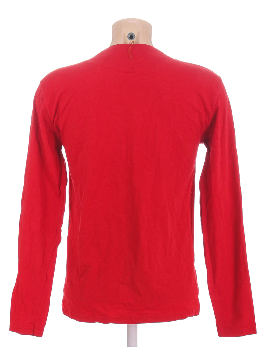 Ткань местами выцвела. Есть немного катышек. По горловине спереди на разрезе есть повреждения материала. По плечевому шву немного распускается нить по шву. Местами по швам распускается нить.
