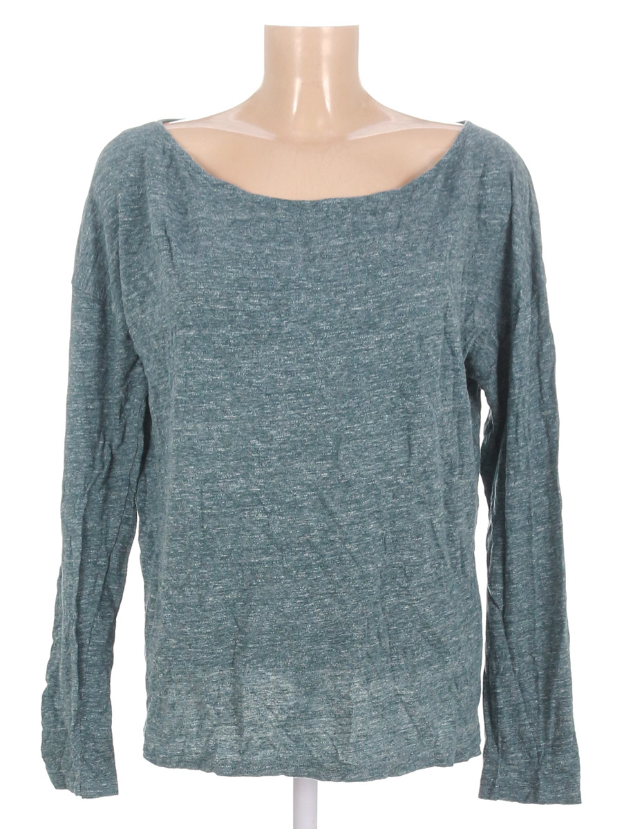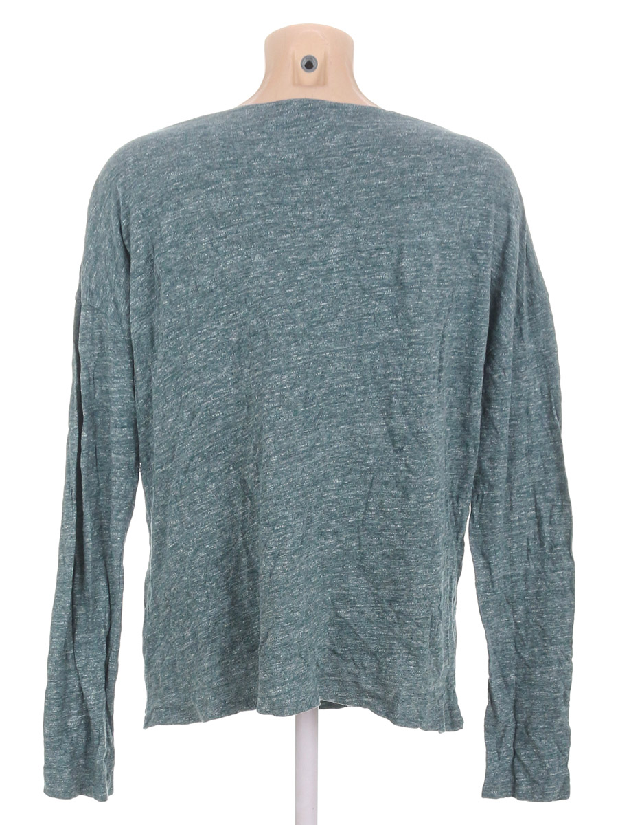 Сине-зеленый оттенок. Есть мелкие катышки, ткань потускнела, вытянулась.