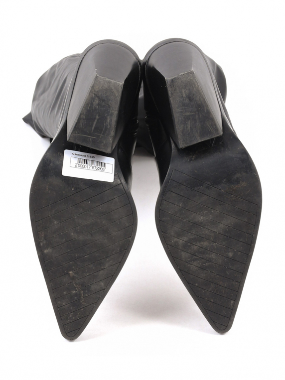 Износ подошвы. Есть царапинки. Есть небольшие повреждения материала. Есть потертость материала на каблуке.
