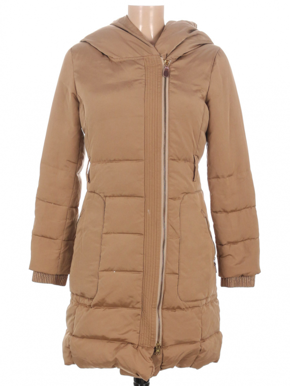 Есть небольшие загрязнения, затяжки, на подкладе около петельки дырочки, слежался/торчит наполнитель, в области подмышки дырочка по шву, нет пояса.