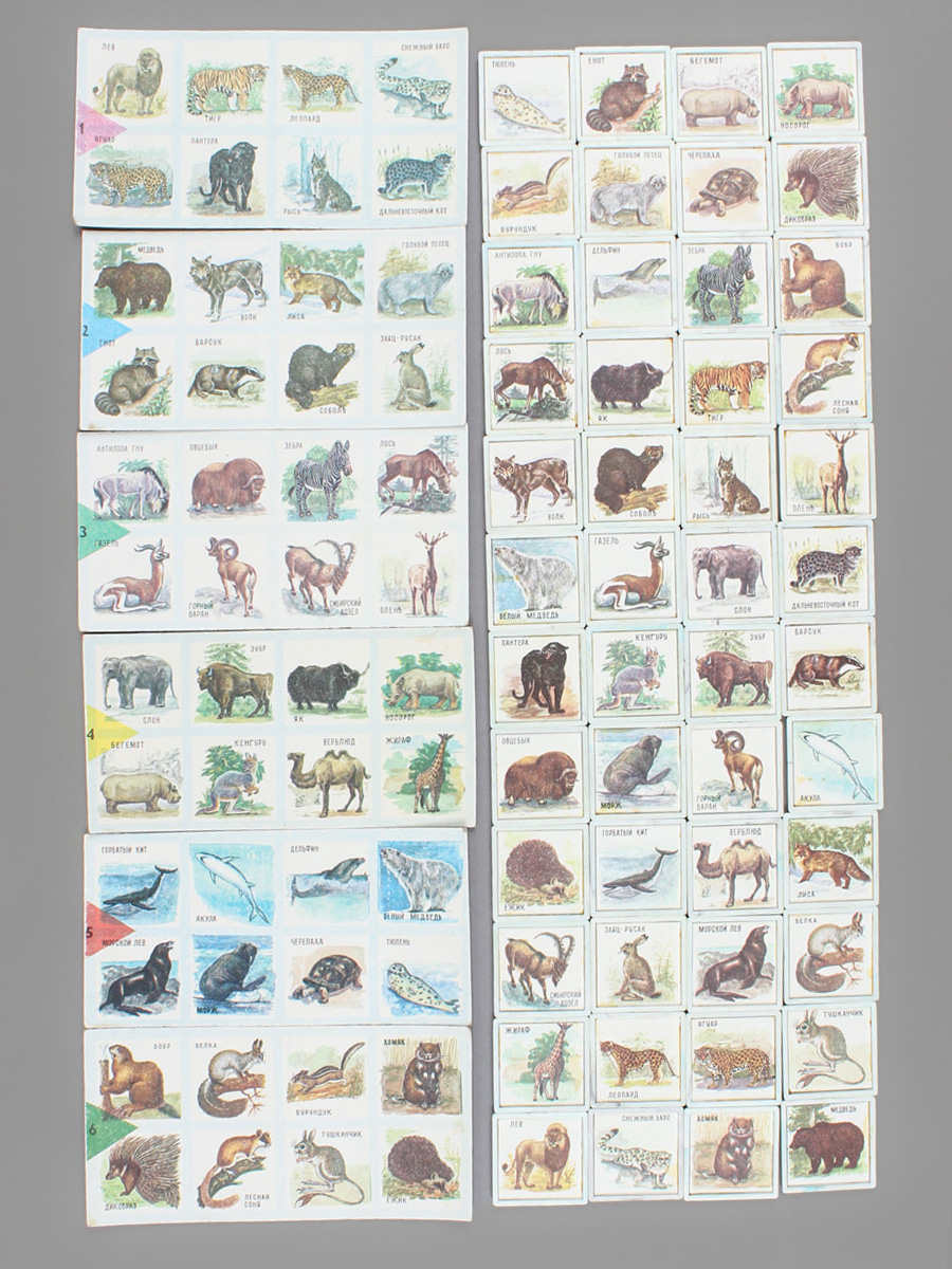 Не хватает деталей. В игре 6 карточек с животными и 48 фишек. Есть потертости.