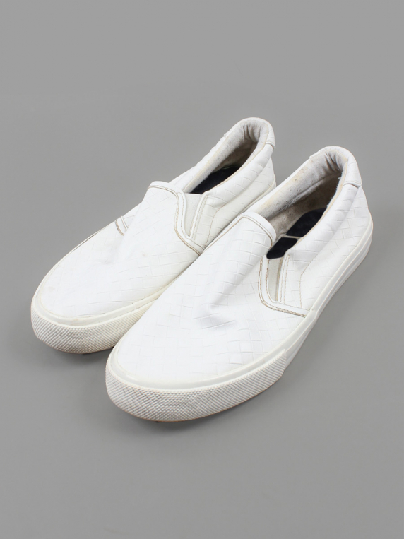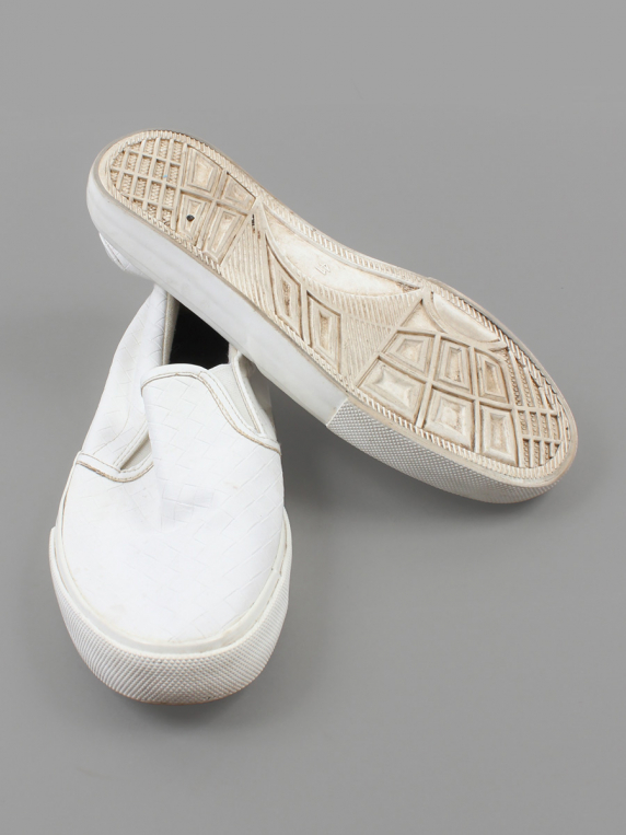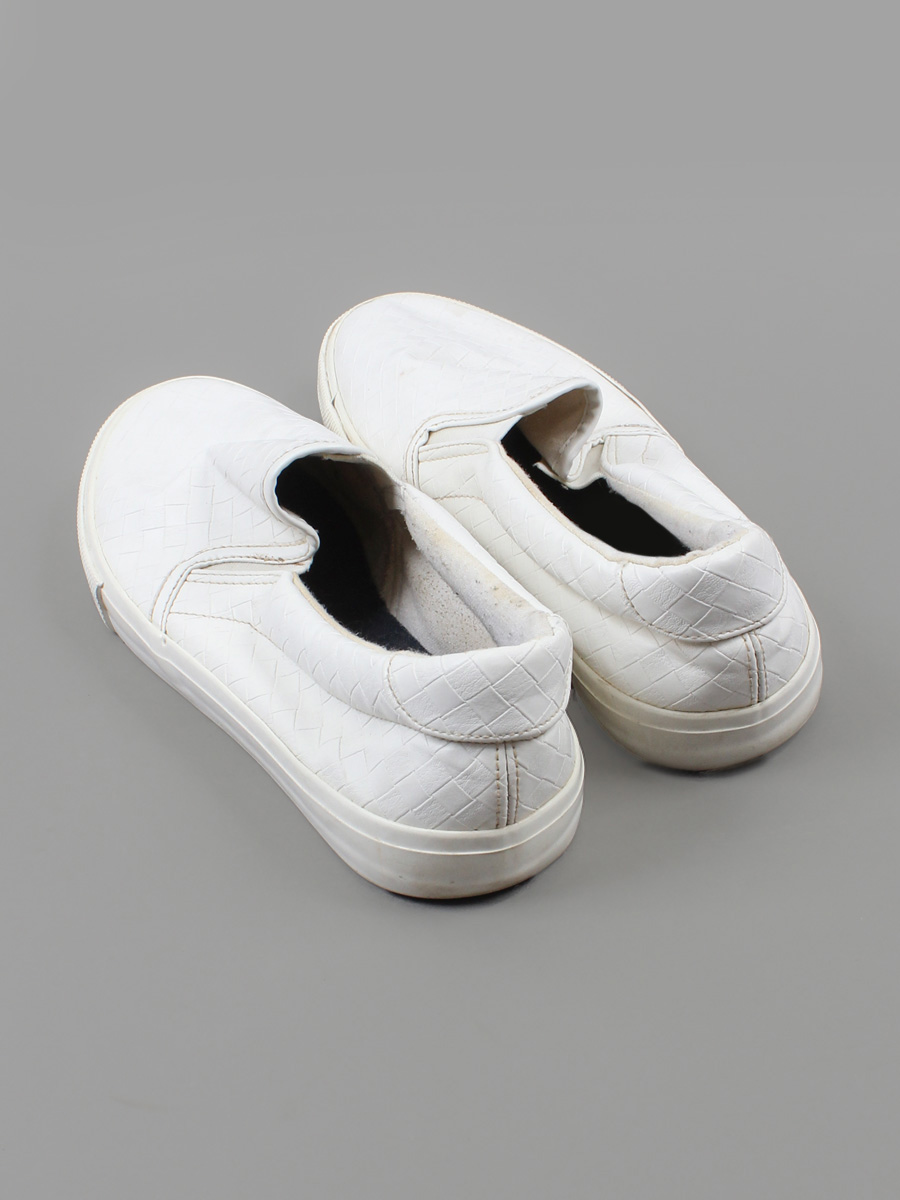 Есть загрязнения, катышки, небольшой износ подошвы.