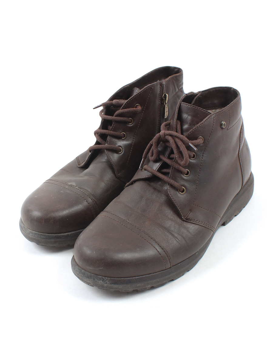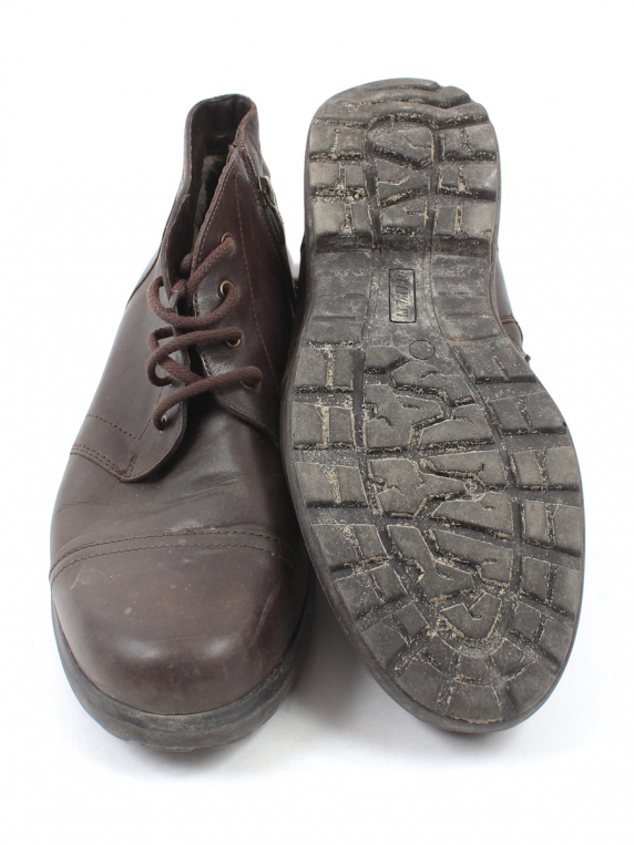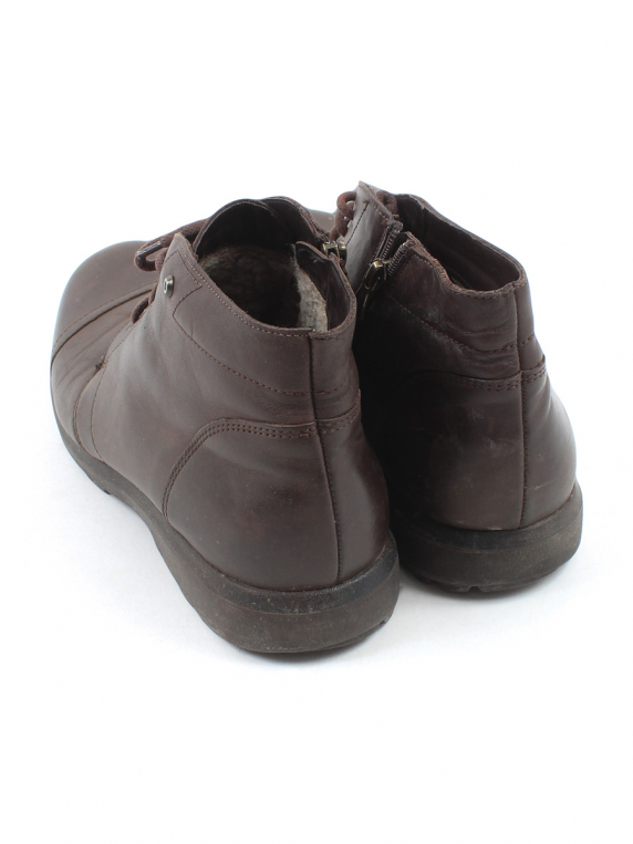 На изделии есть знак "кожа". Есть загрязнения, заломы, потертости материала, слежался/стоптался мех.