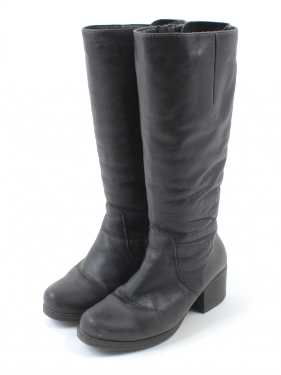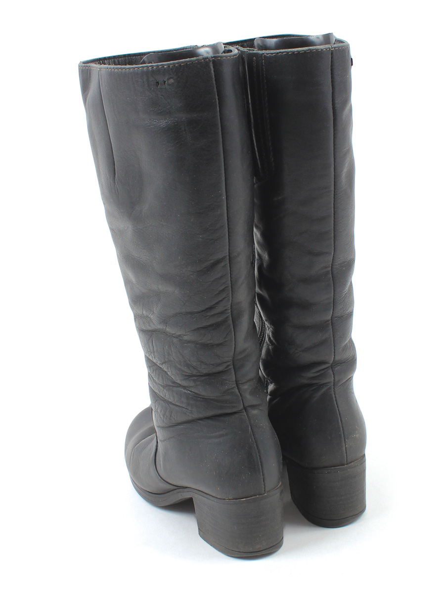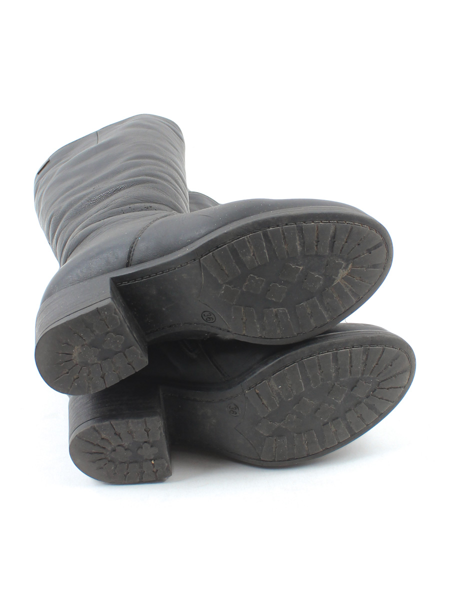 Есть загрязнения, заломы, потертости материала, небольшой износ подошвы, на одном сапоге есть дырочки от металлического ярлыка.