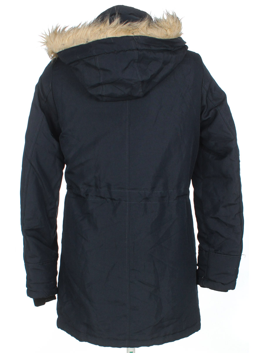 Есть катышки, загрязнения на манжетах, воротнике, затяжки, слежался мех на капюшоне. Ткань местами немного лоснится.
