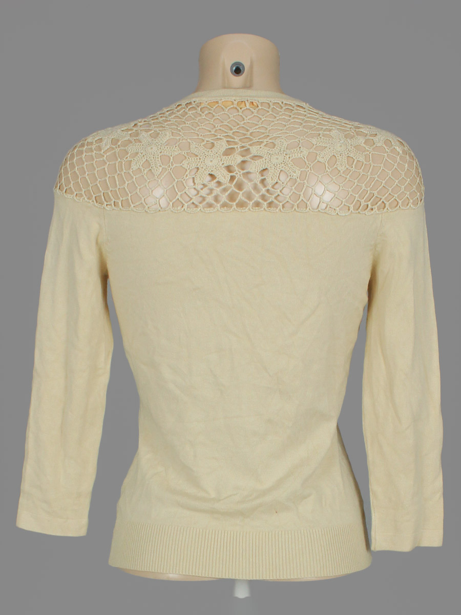 Замер длины рукава от горловины. Есть мелкие катышки и затяжки, небольшое пятнышко на рукаве. Ткань немного вытянулась.