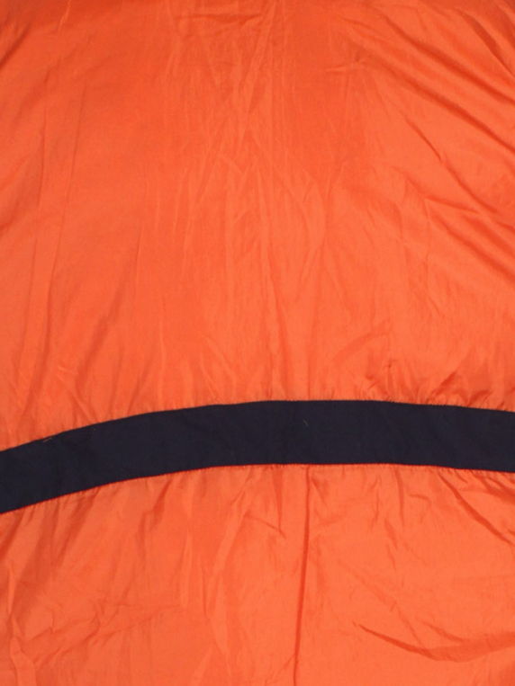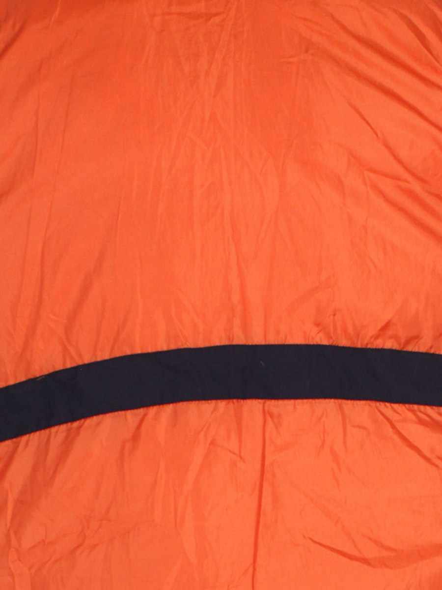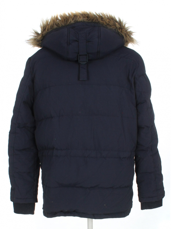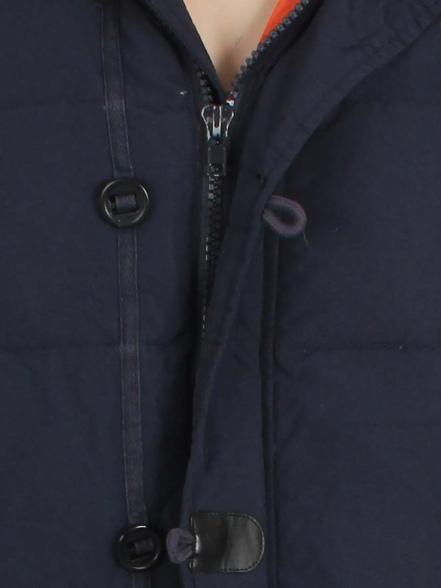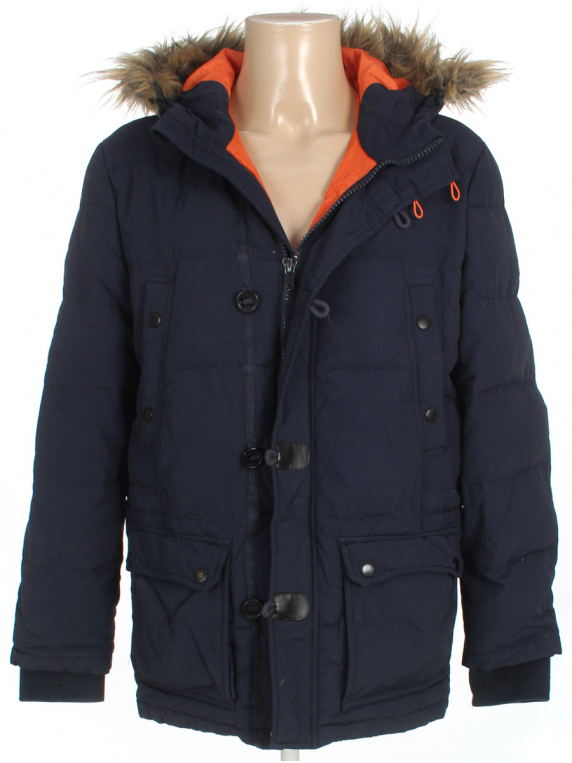 Есть катышки, загрязнения, пришита петелька от руки, скалывается краска на бегунке. Ткань местами лоснится. Слежался мех на капюшоне, сбился наполнитель. Трескается покрытие на черных вставках спереди.