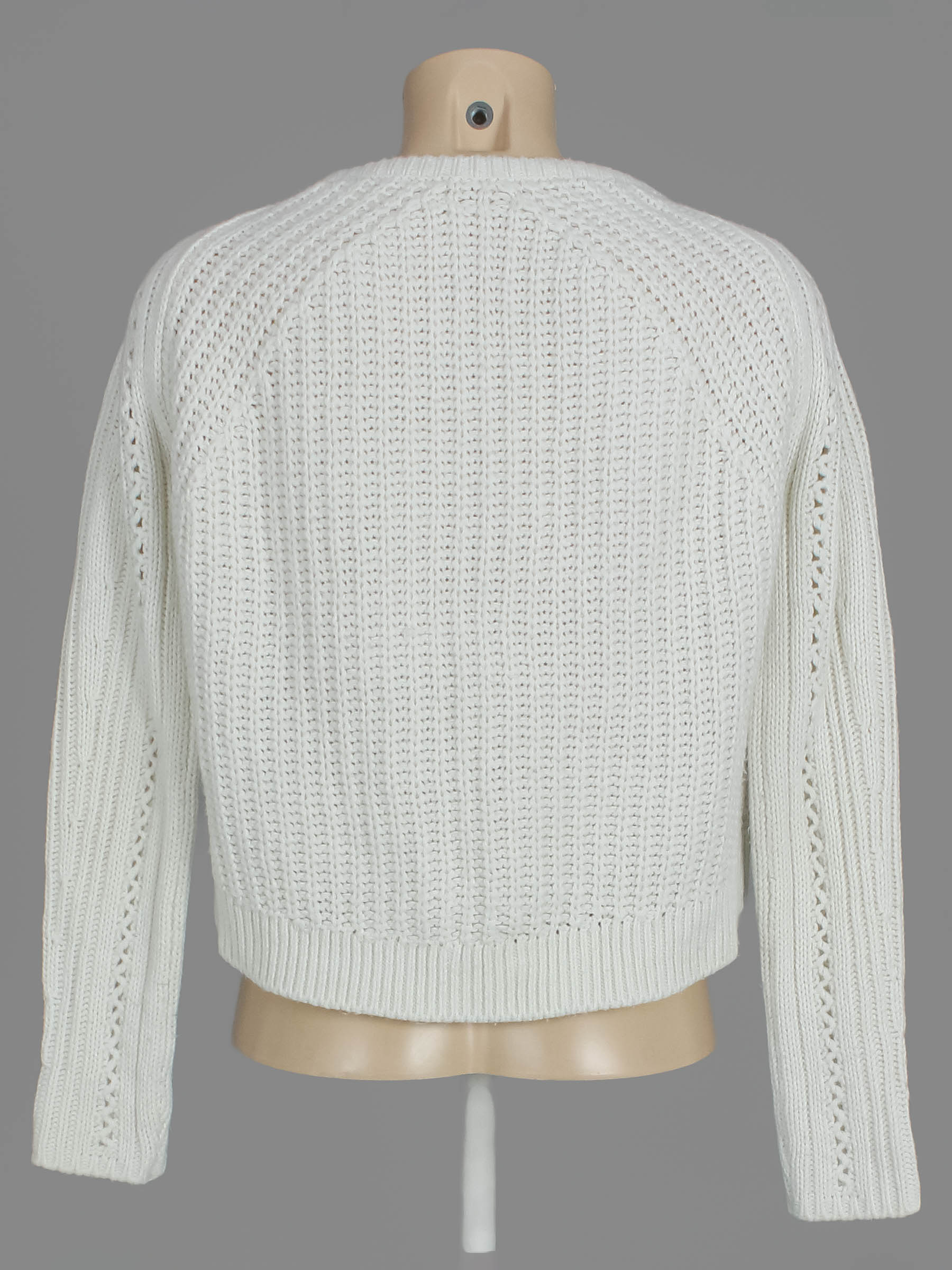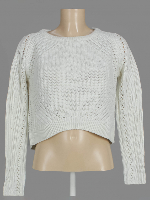 Маркировка на изделии отсутствует. Размер указан на основании замеров (42-44). Есть катышки, затяжки, загрязнения, ткань потускнела, местами вытянулась. Замер рукава указан от горловины. В области подмышек немного пожелтел материал.