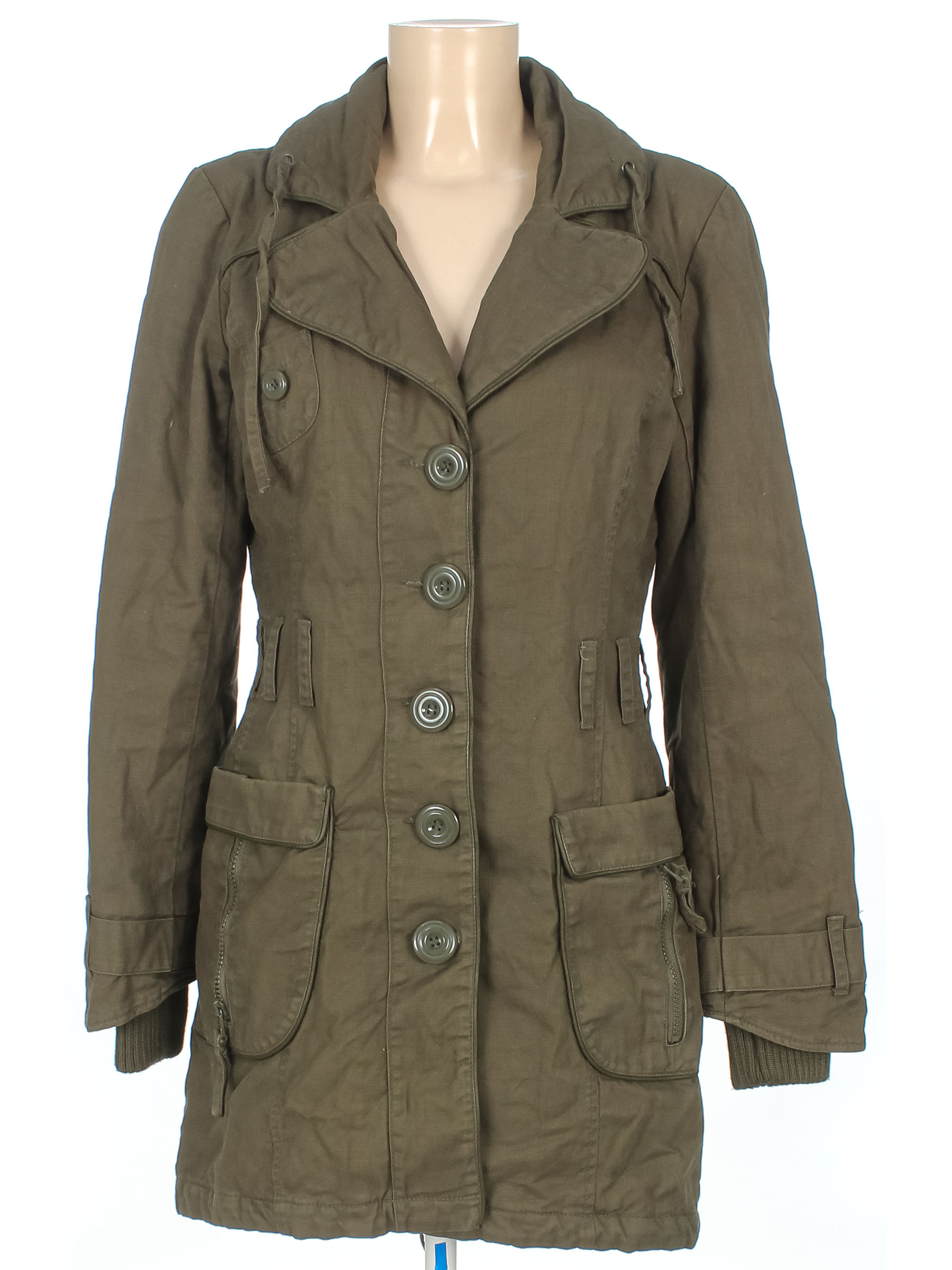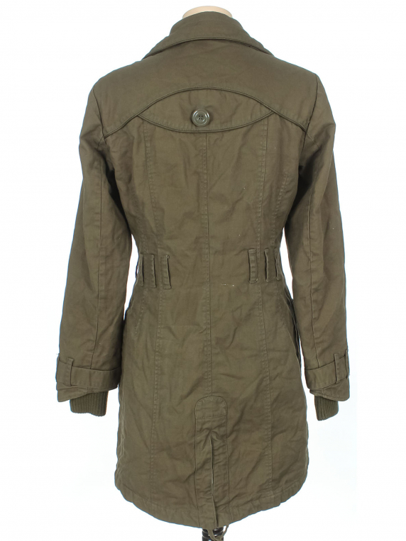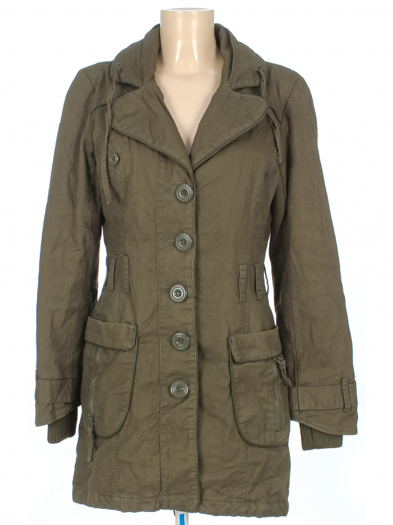 Есть катышки на манжетах, выцветшее пятнышко на рукаве, ткань местами немного выцвела, нет пояса.