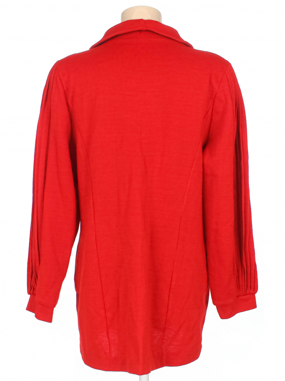 Низ изделия не обработан, подшит от руки. Спереди по низу и на правом плече маленькие дырочки. Есть катышки, затяжки, пятнышки (возможно отстирается). Немного лоснится ткань.