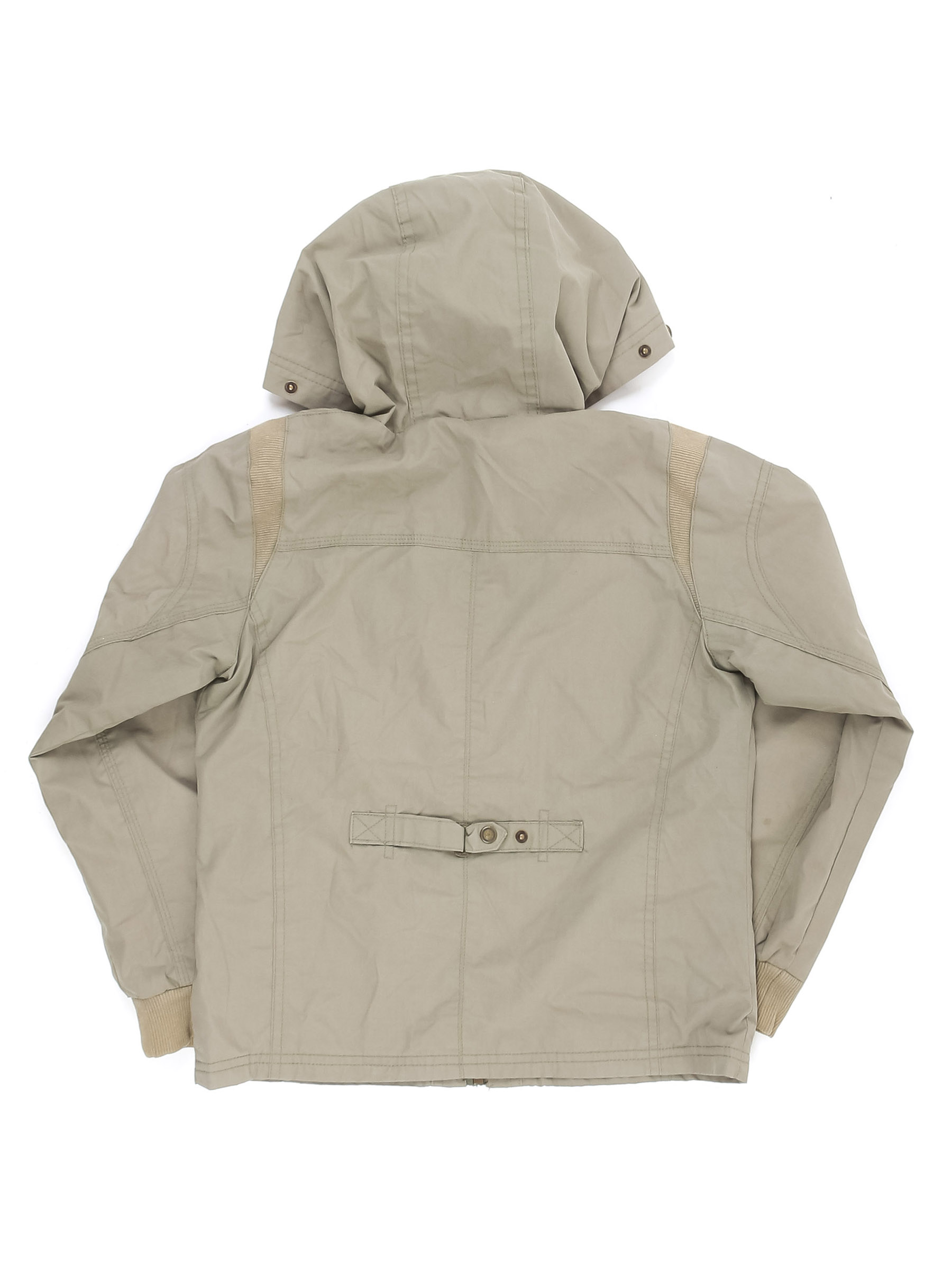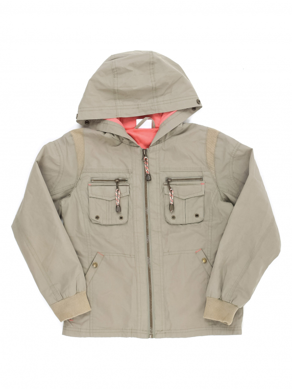 Серо-зеленый. На подкладе есть катышки, спереди немного распускается строчка по шву, на манжетах немного выцвел материал.