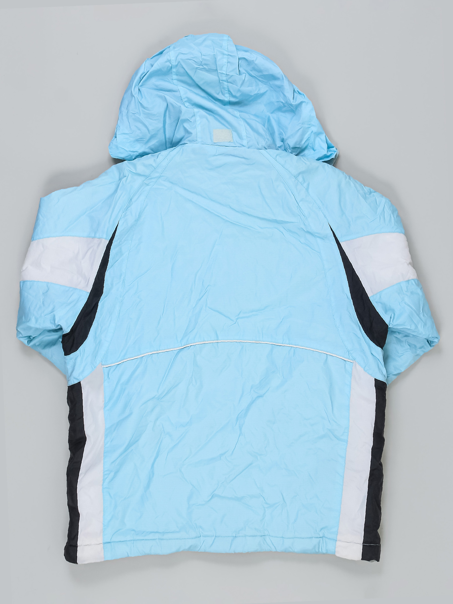 Есть загрязнения, порез на рукаве около 1 см, ткань потускнела, местами немного сбился наполнитель. Замер рукава указан от горловины.