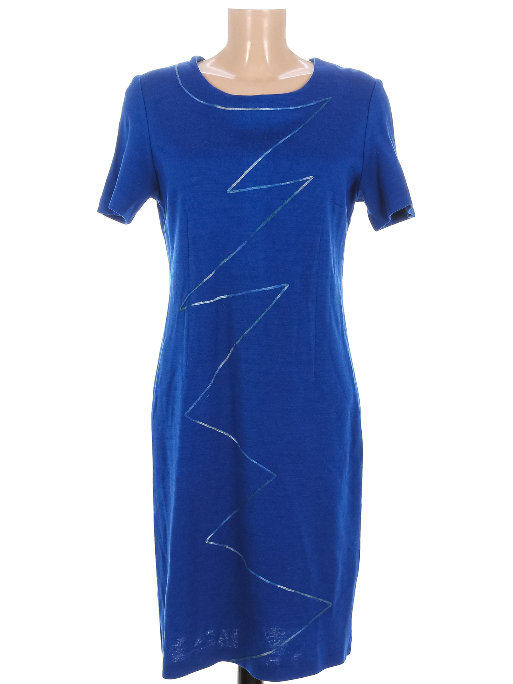 Маркировка на изделии отсутствует. Размер указан на основании замеров (44-46). Ткань местами лоснится, спереди есть затяжка, немного катышек по швам.