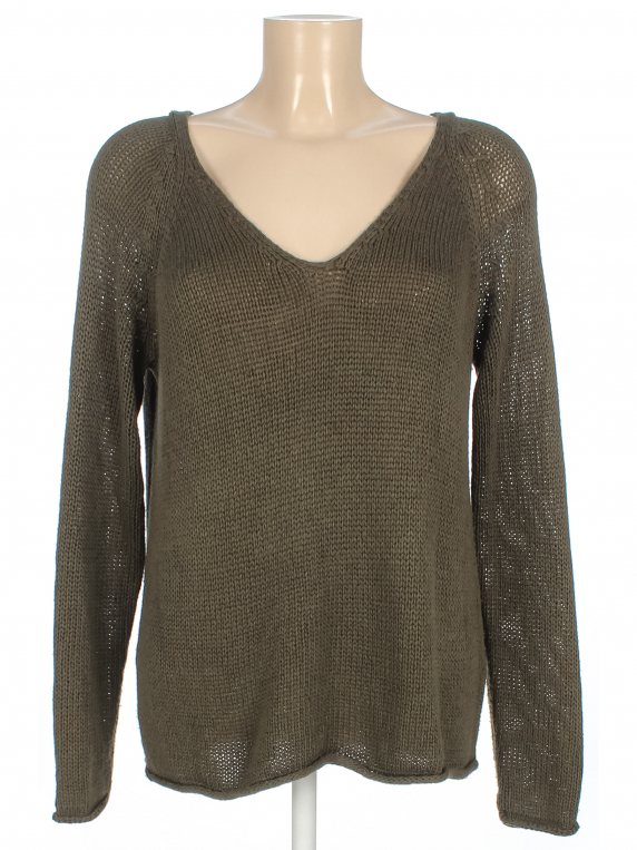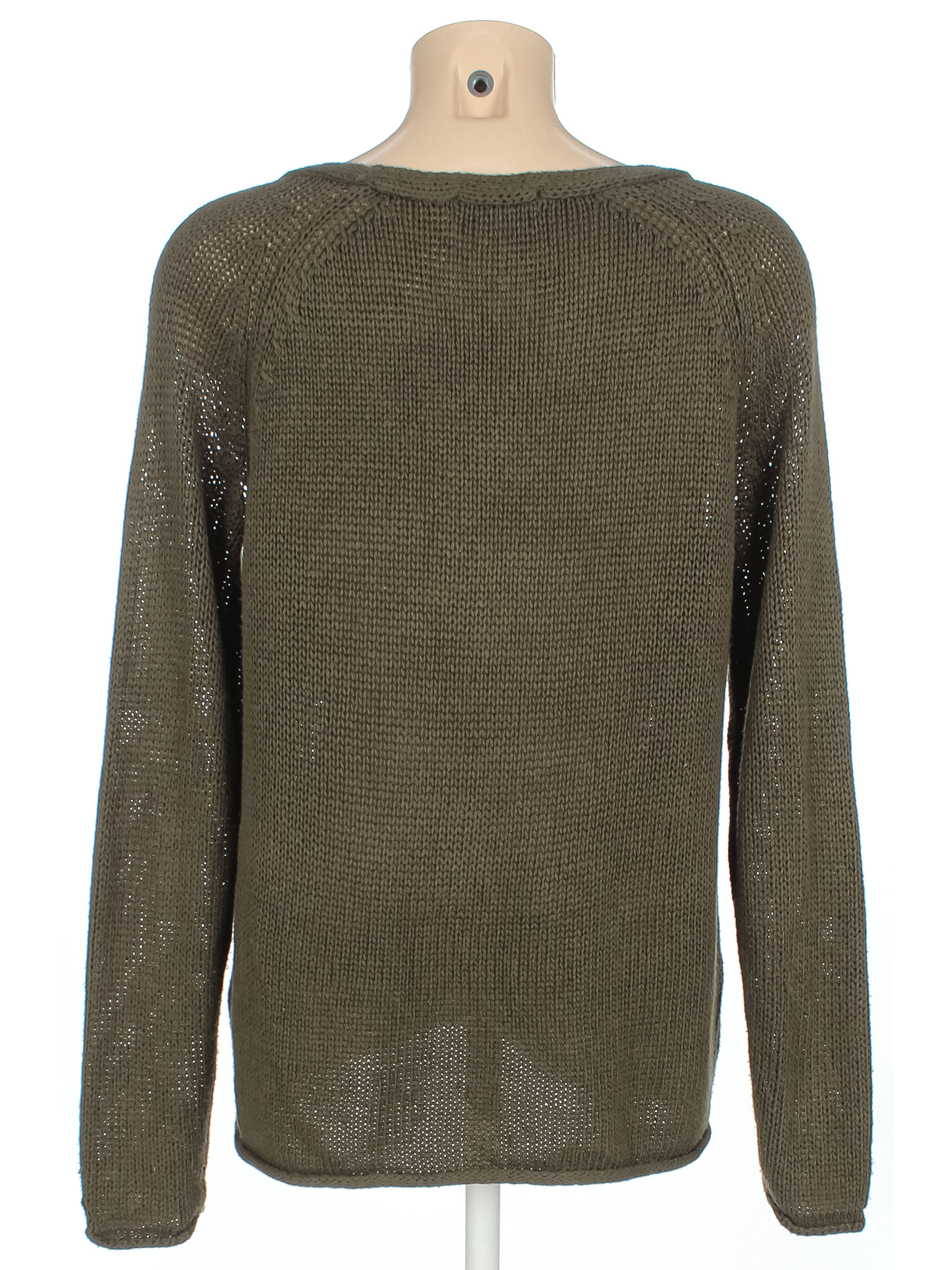 Оттенок хаки. Замер рукава указан от горловины. Есть катышки, затяжки, ткань местами немного вытянулась, лоснится.