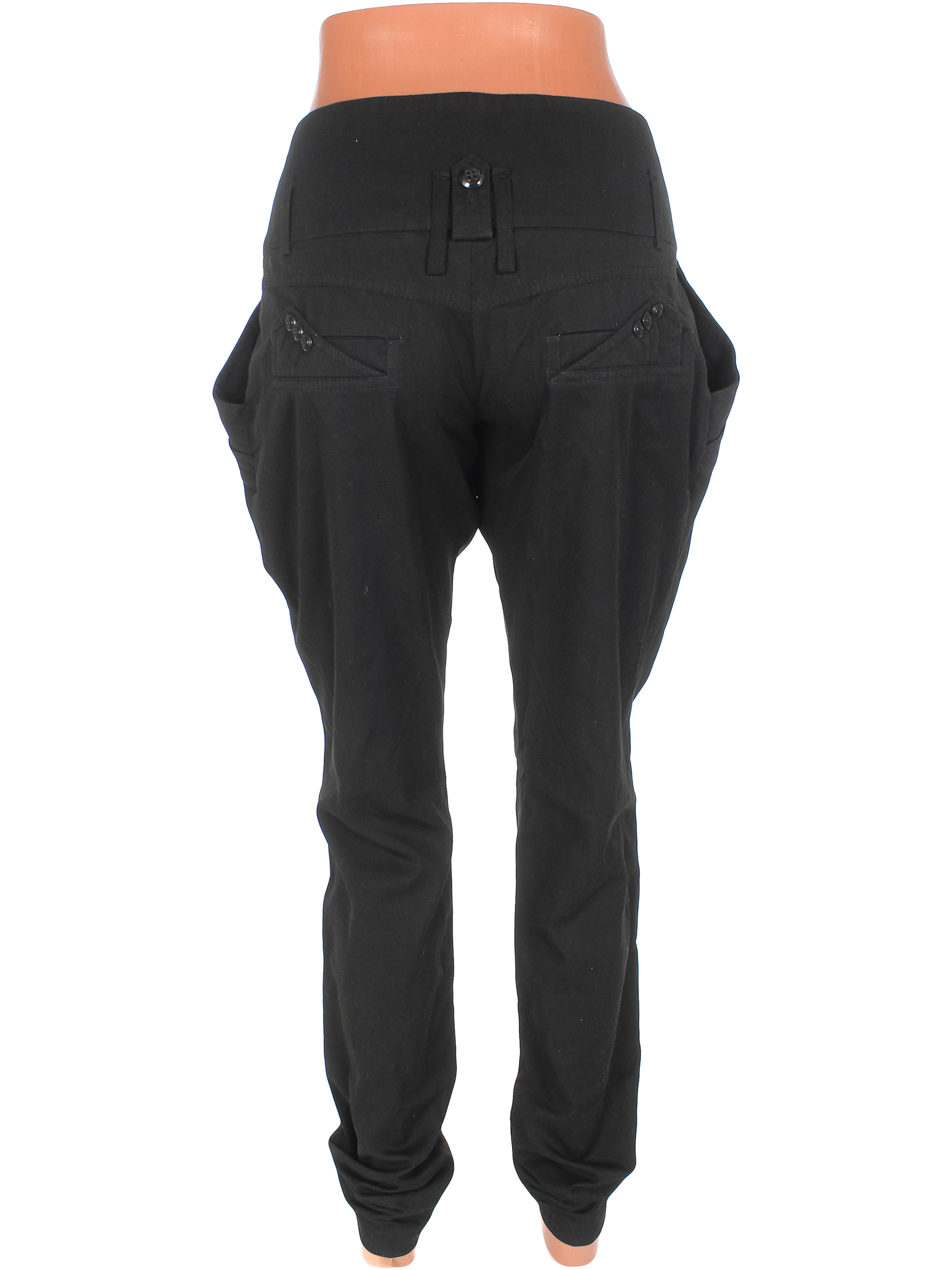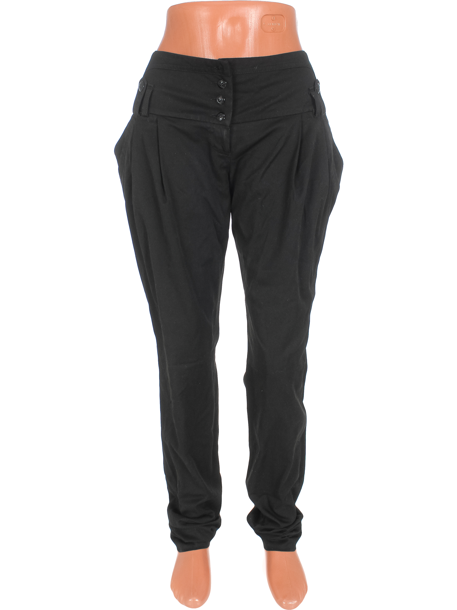 Маркировка на изделии отсутствует. Размер указан на основании замеров. На поясе нет пуговицы. По низу распустиласть строчка по шву. Есть поверхностные загрязнения, ткань немного потускнела, местами лоснится.