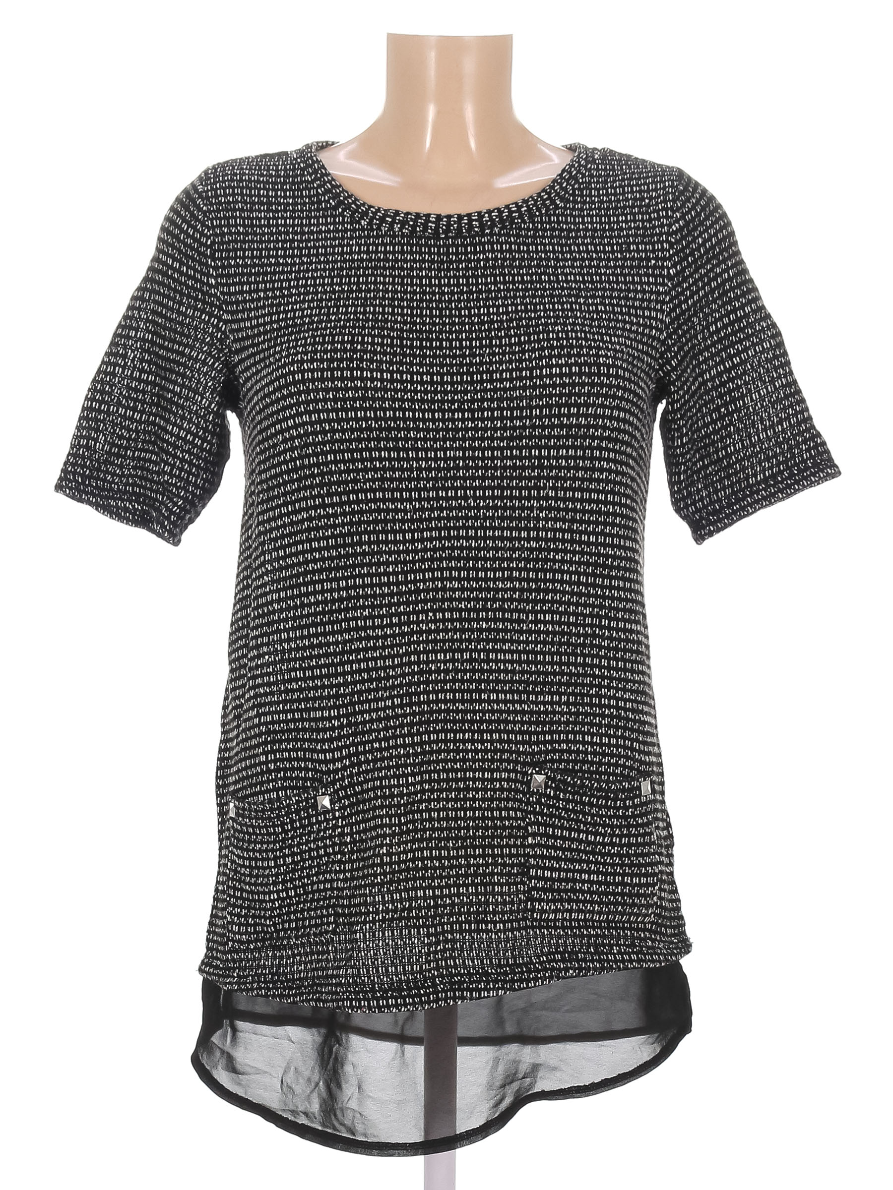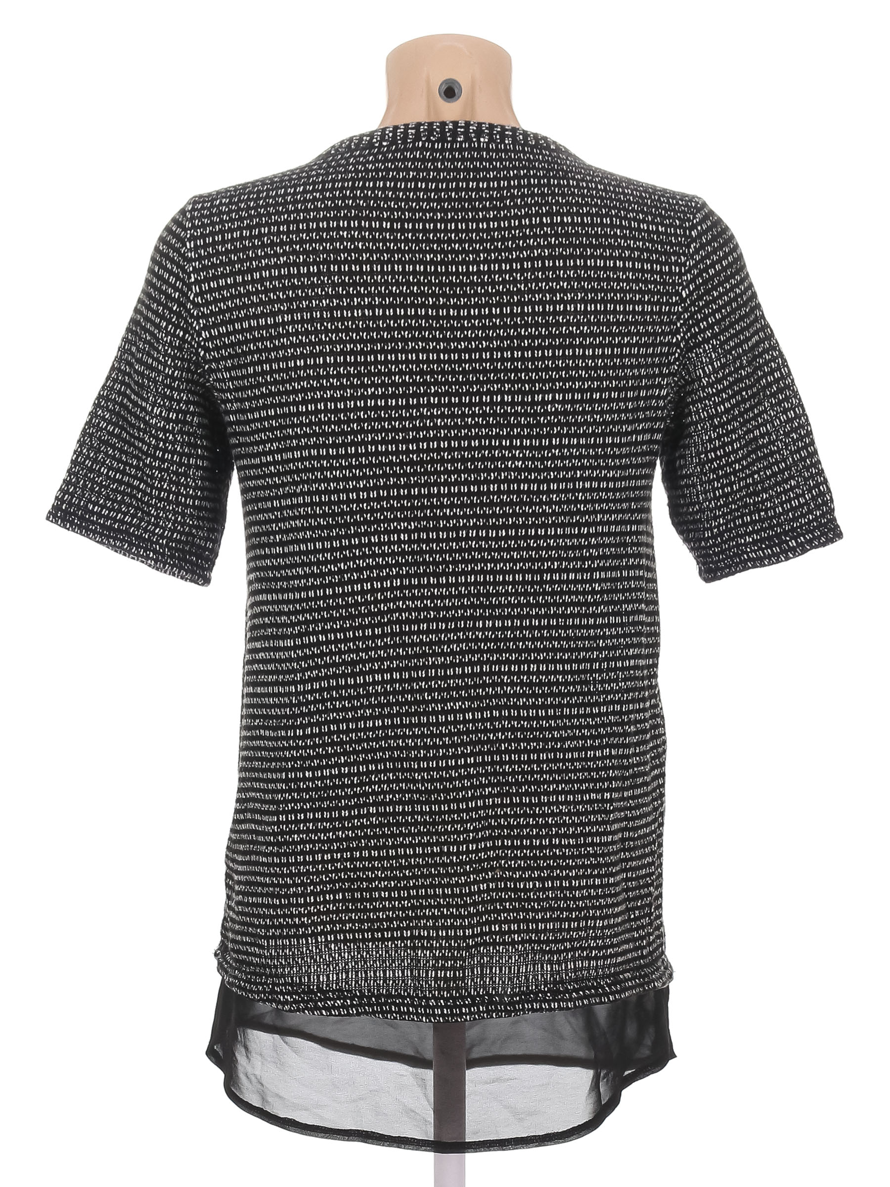 Есть катышки, загрязнения, в том числе в области подмышек, ткань вытянулась. по низу распускается строчка по шву.