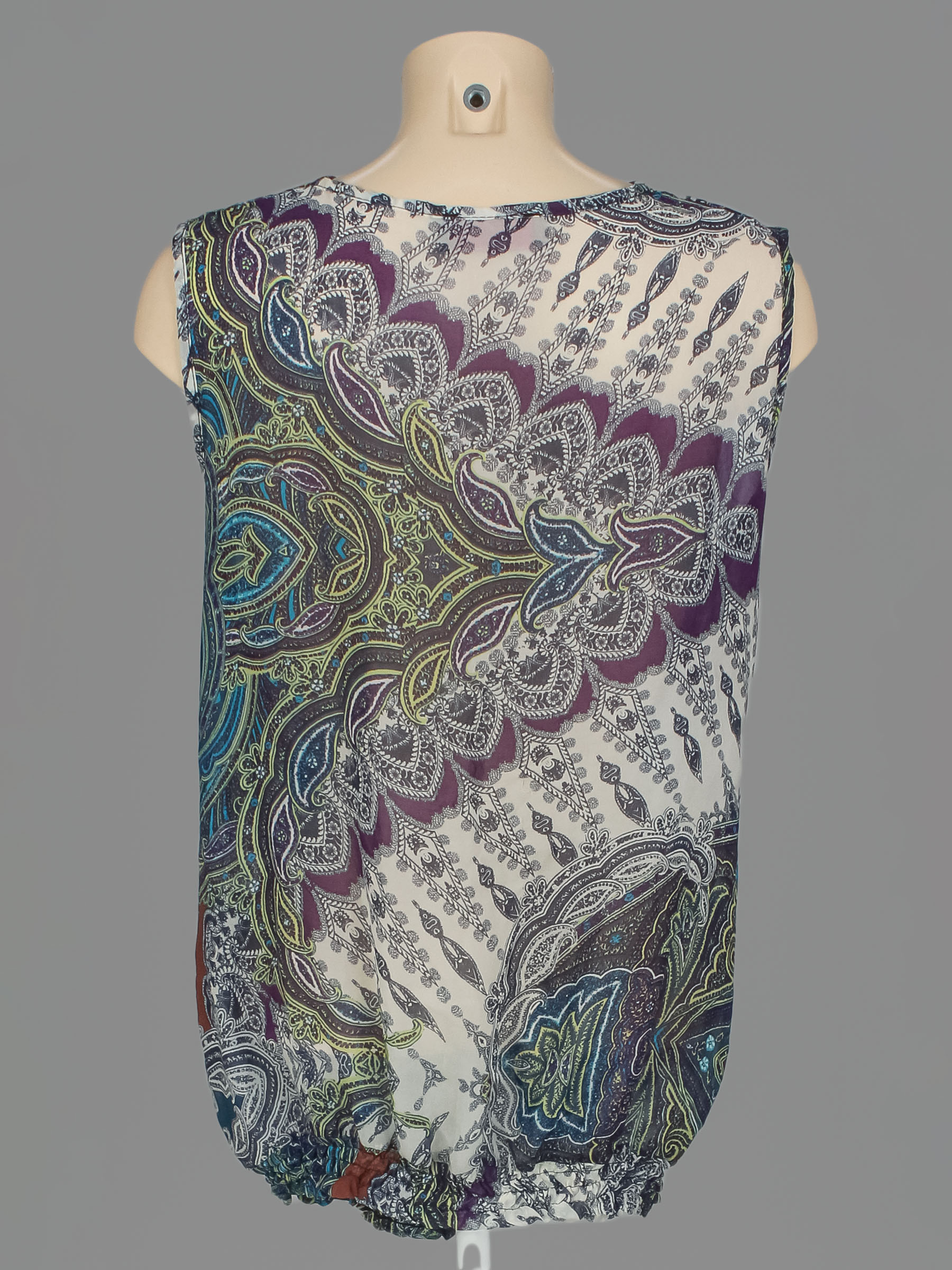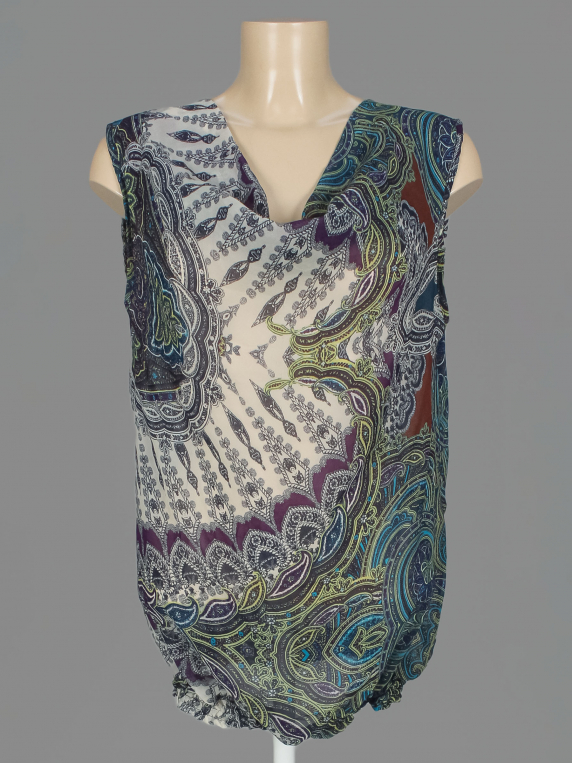 Маркировка на изделии отсутствует. Размер указан на основании замеров. Есть затяжки. Вытянута ткань по швам.