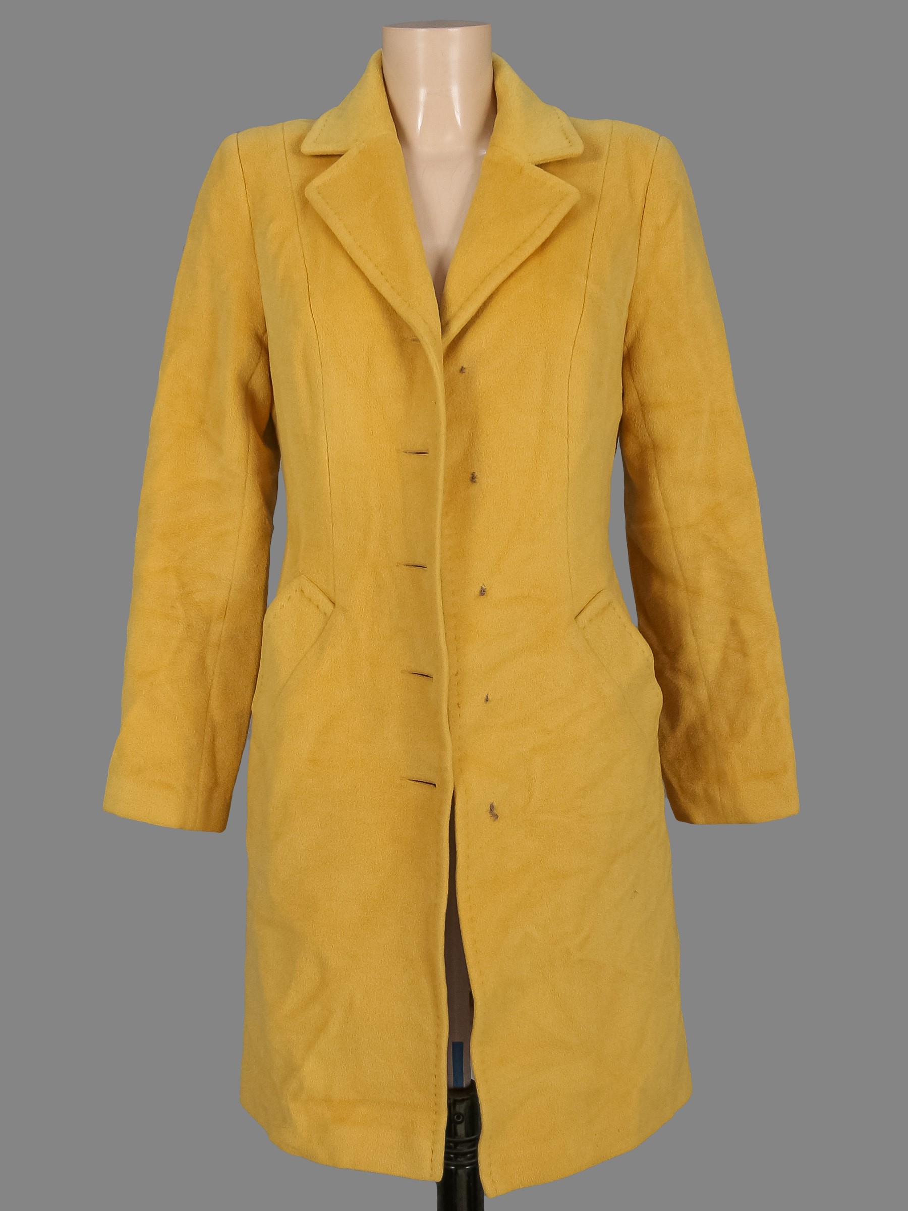 Незначительно вытянута ткань по швам на подкладке. Пуговицы отсутствуют. Есть немного катышек.