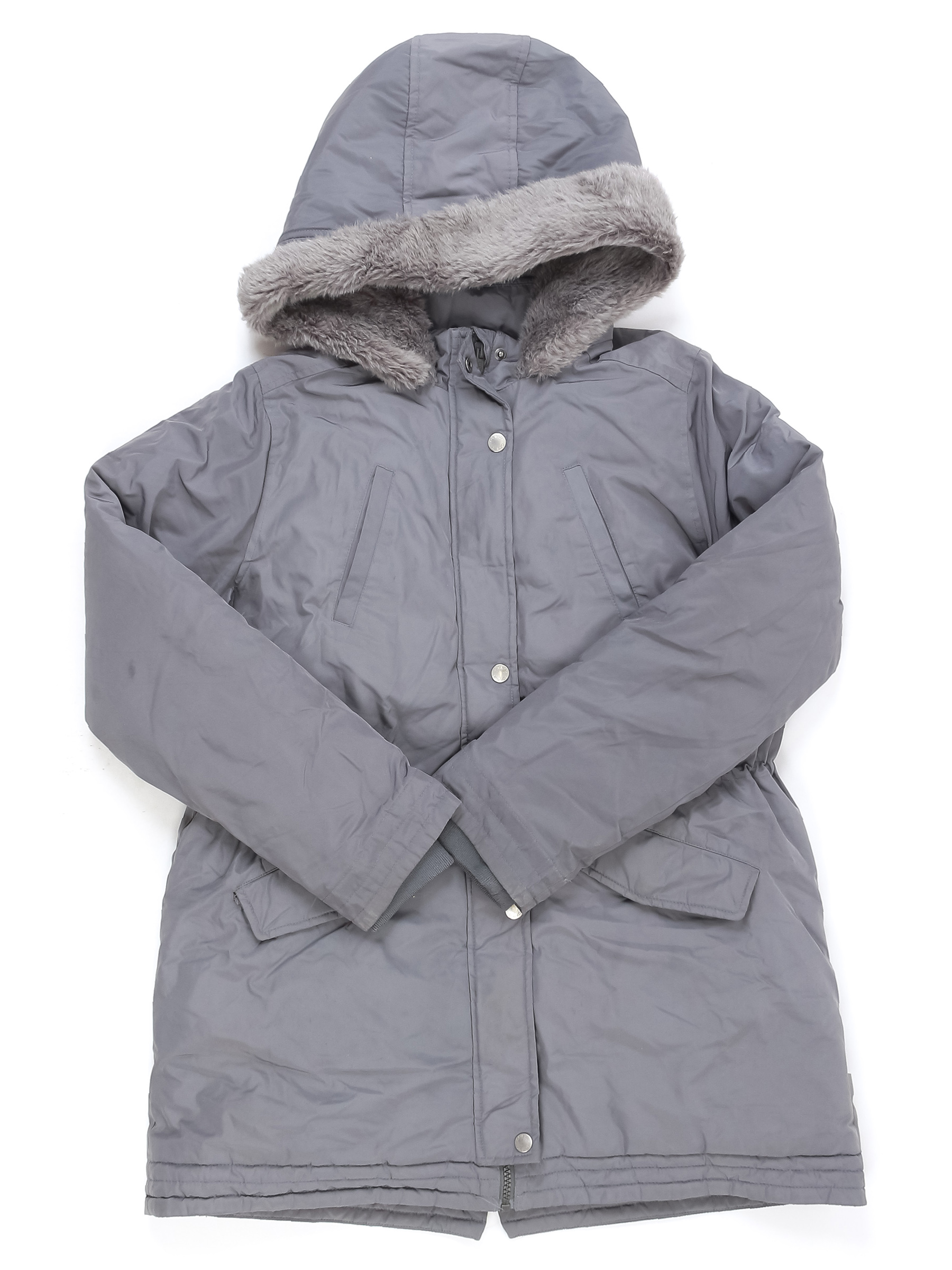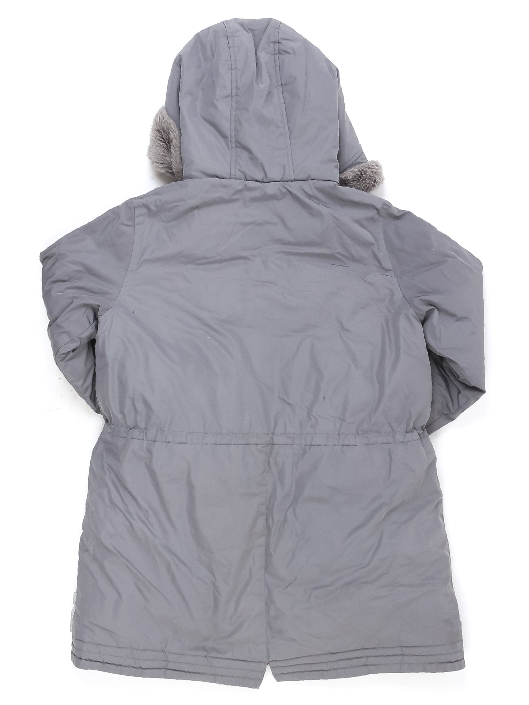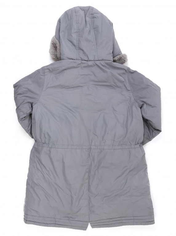 Есть загрязнения в нескольких местах, катышки на манжетах, ткань местами лоснится, немного сбился наполнитель.