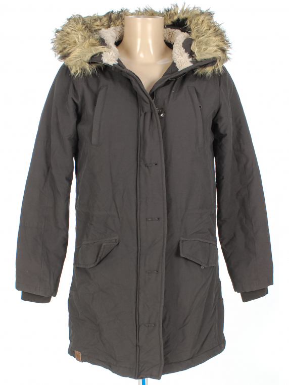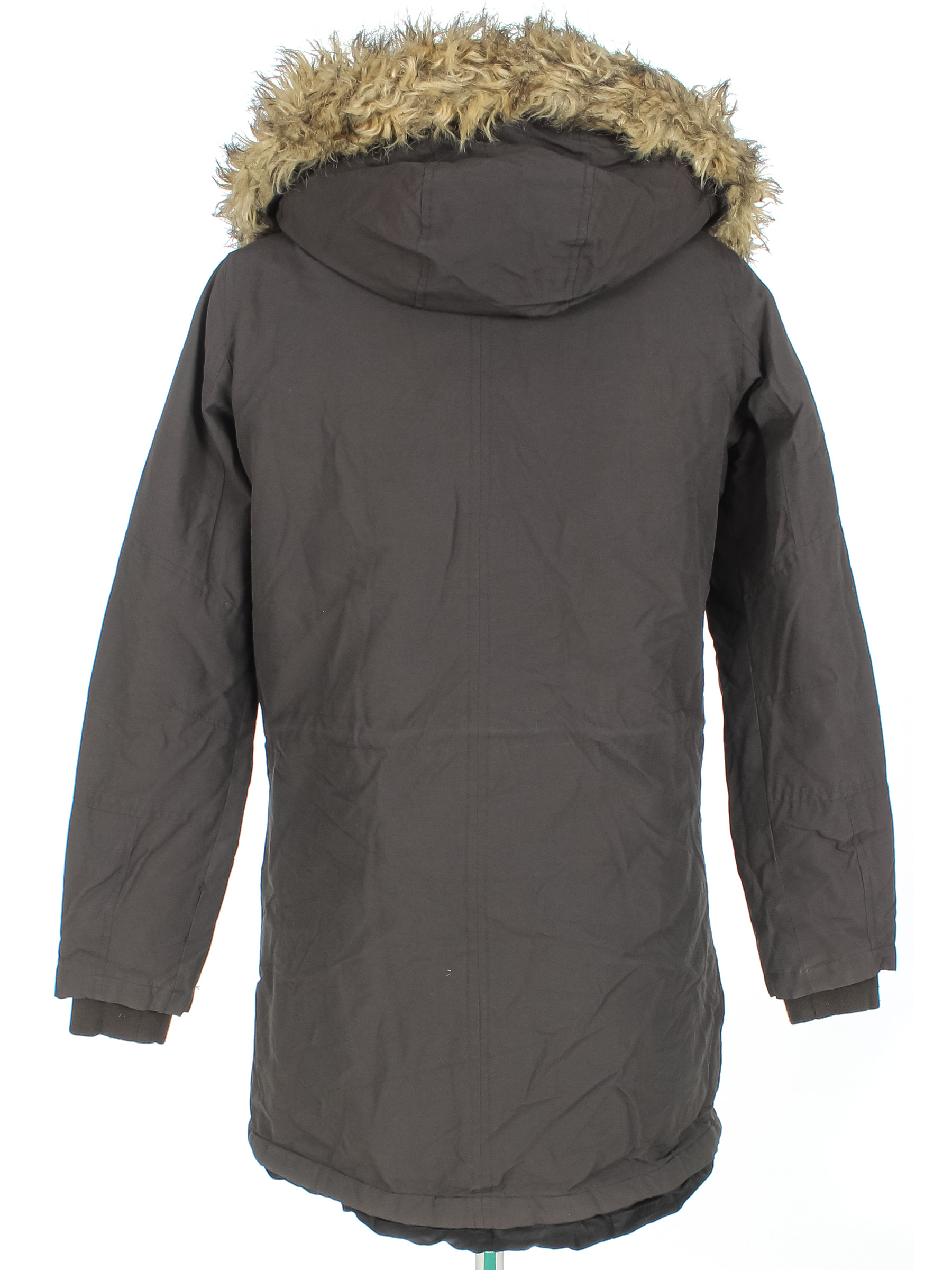 Маркировка на изделии 36. Размер указан на основании замеров. Есть дырочка по шву на рукаве, катышки на манжетах, поверхностные загрязнения, ткань потускнела, небольшие потертости материала, слежался мех на капюшоне.