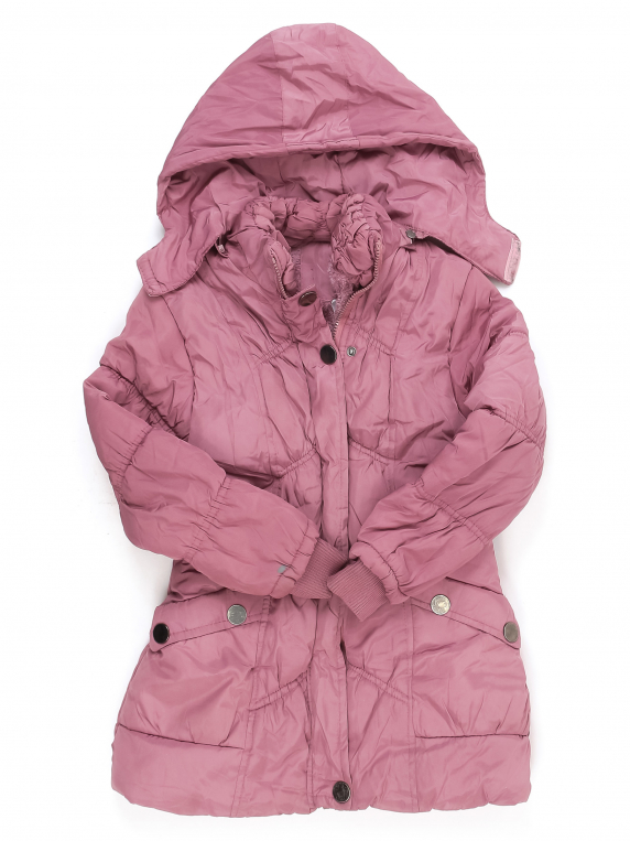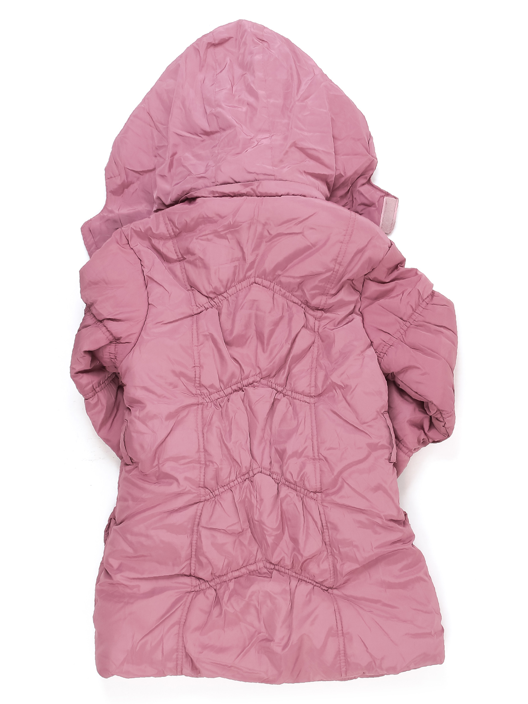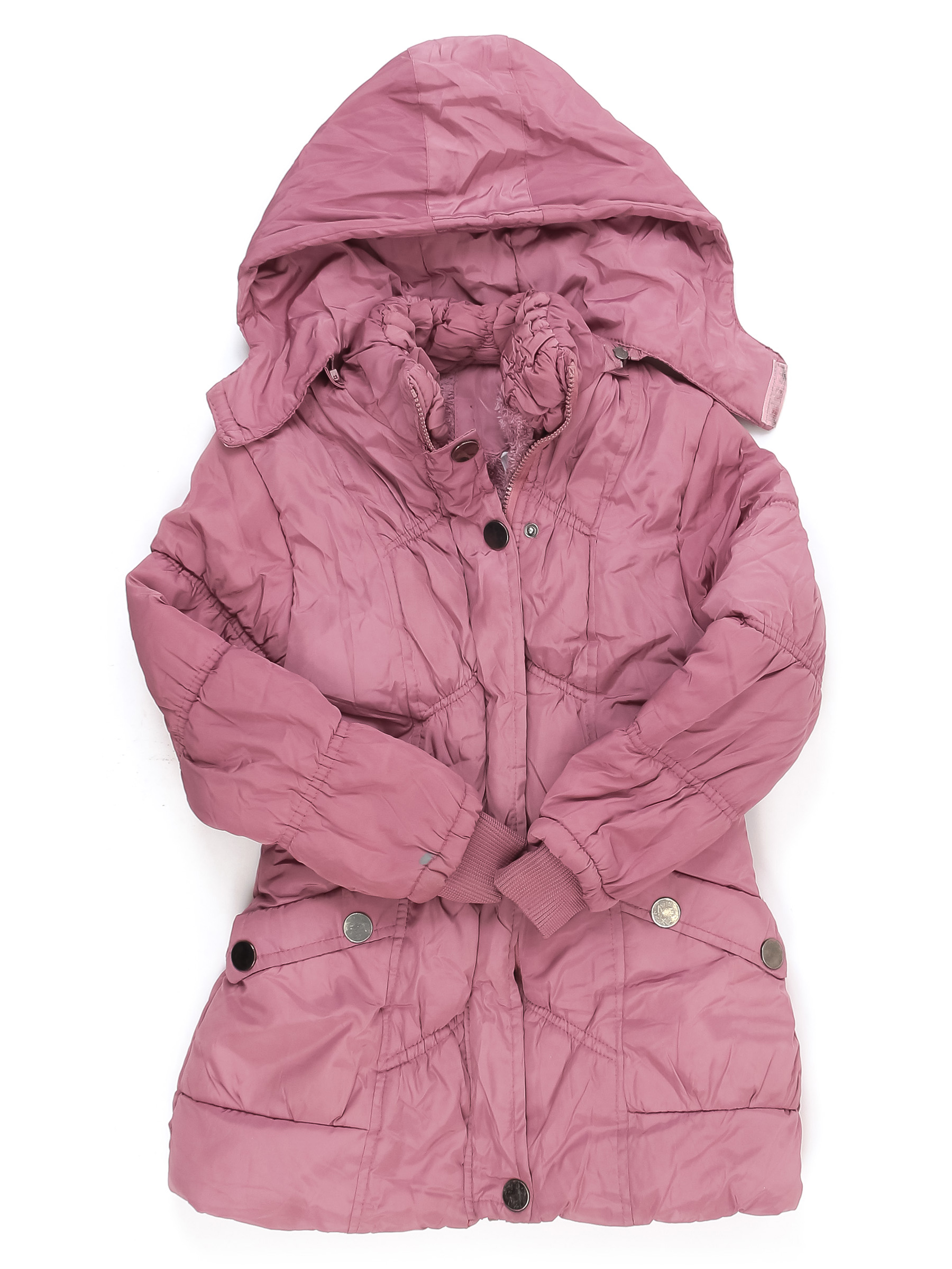 Маркировка на изделии отсутствует. Возраст указан предположительно . Нет бегунка, изнутри скатался ворс. На подкладе есть стрелки, зашит материал вручную, загрязнения, стирается покрытие и царапины на кнопках. Нет пояса. Местами немного сбился наполнитель.