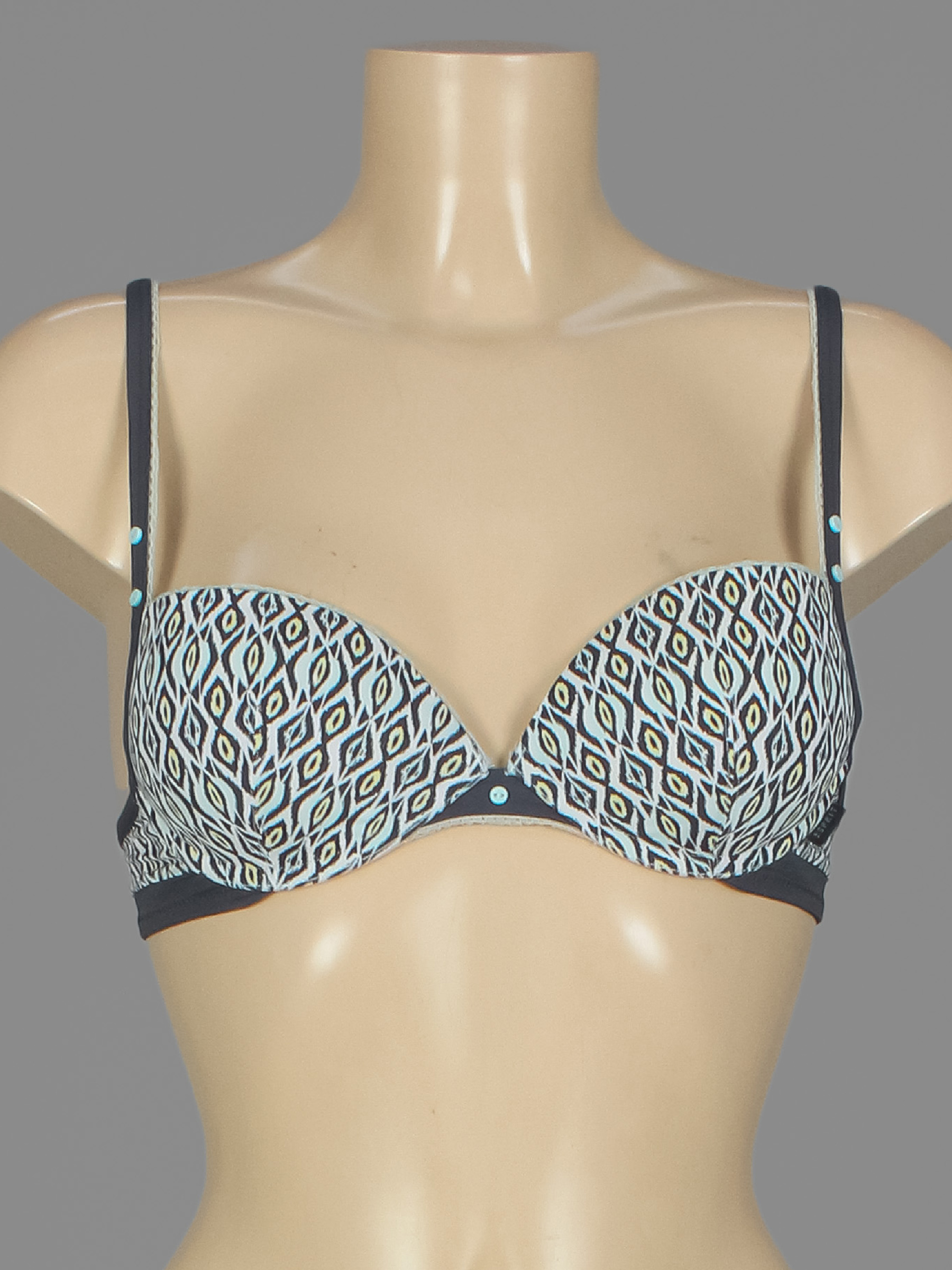 Есть катышки, на чашках заломы, ткань потускнела, местами вытянулась.
