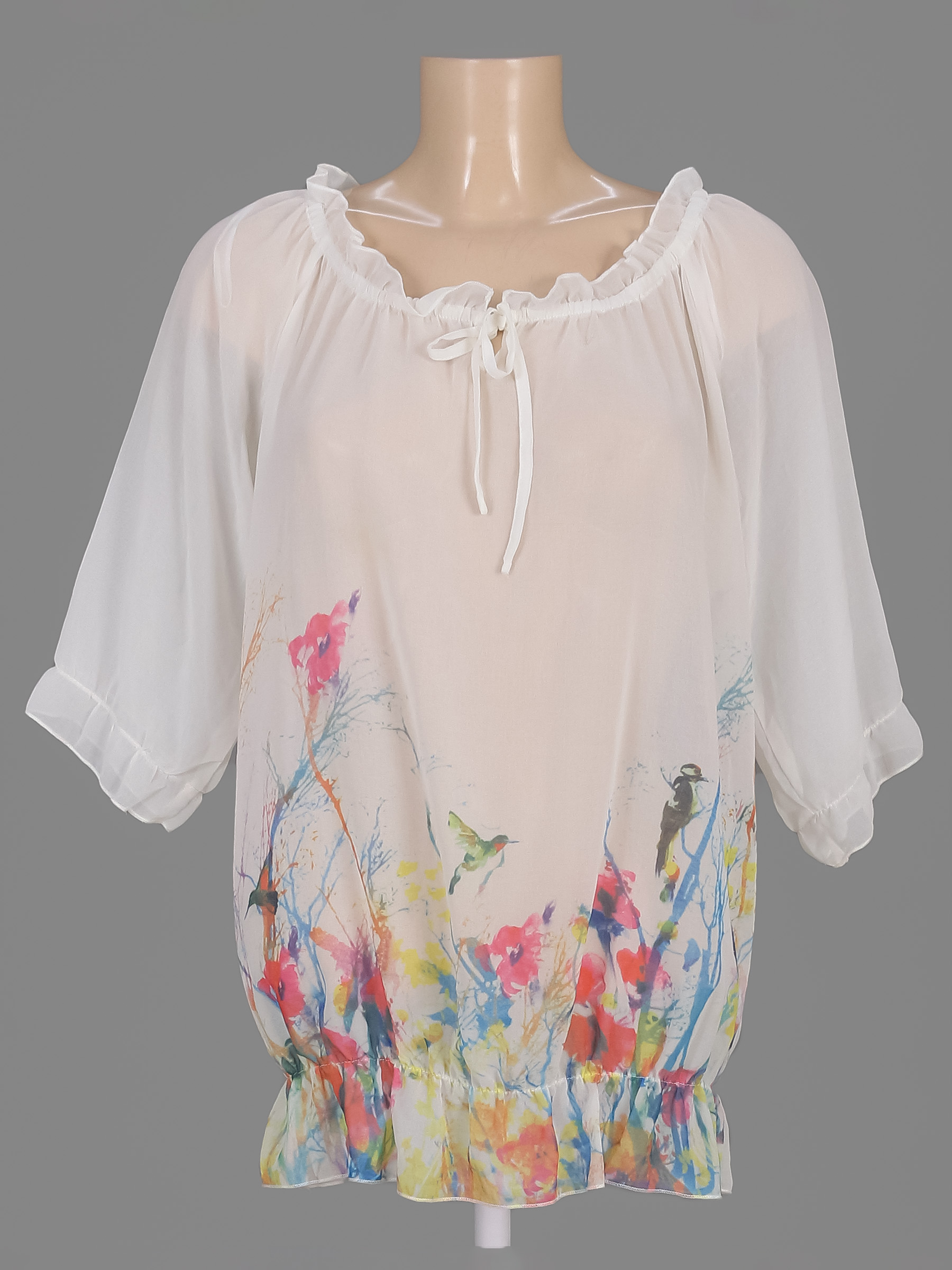 Маркировка на изделии 44. Размер указан на основании замеров. Замер рукава указан от горловины. На спине есть небольшая деформация материала.