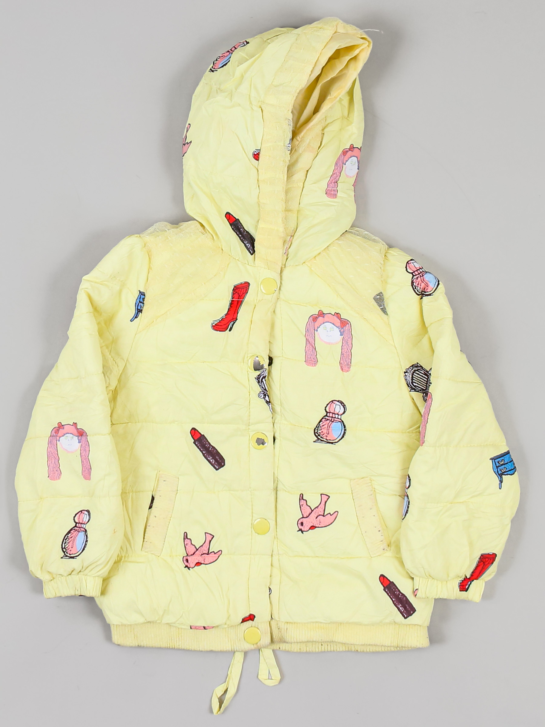Маркировка на изделии 6. Возраст указан предположительно. Есть катышки, загрязнения, стирается покрытие на кнопках, несколько дырочек, нет снизу элемента кнопки, сбился наполнитель. Ткань потускнела.