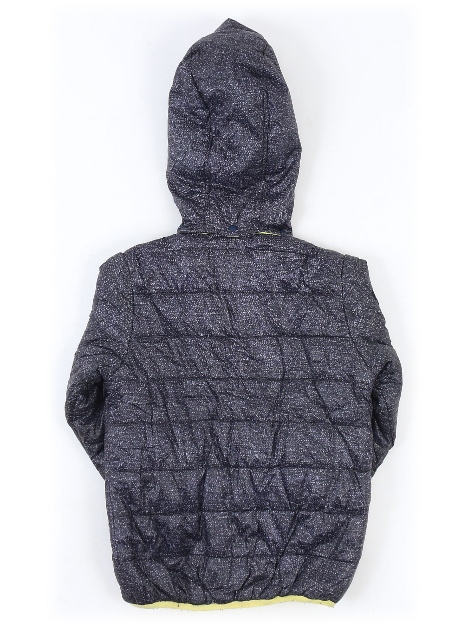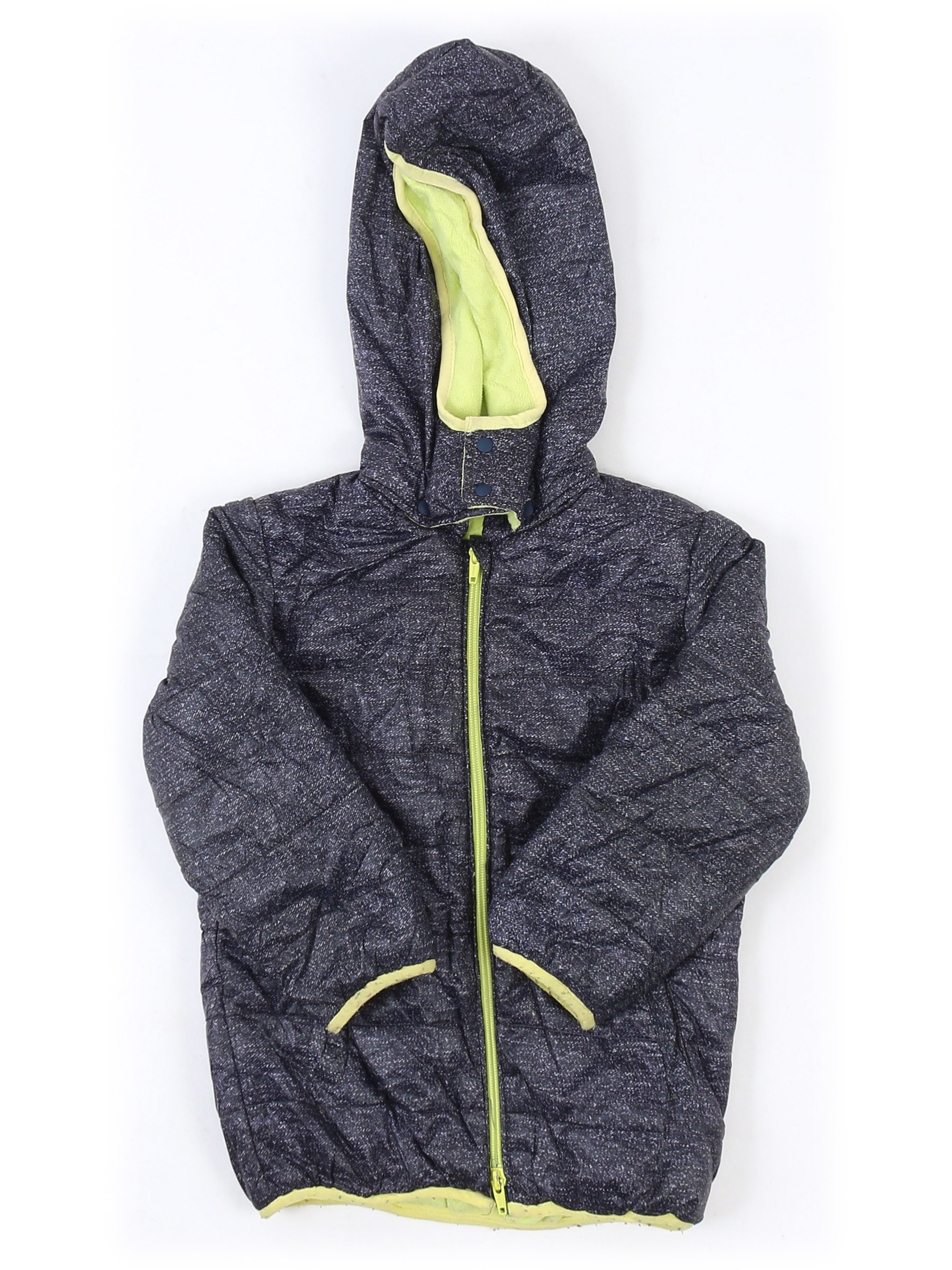 Серо-синий. Есть катышки, небольшие загрязнения, стирается краска на бегунках, местами немного сбился наполнитель.