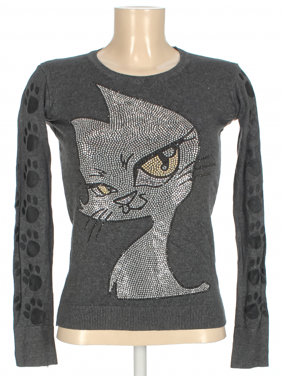 Маркировка на изделии отсутствует. Размер указан на основании замеров. Есть мелкие катышки, ткань местами немного вытянулась, местами отклеиваются стразы.