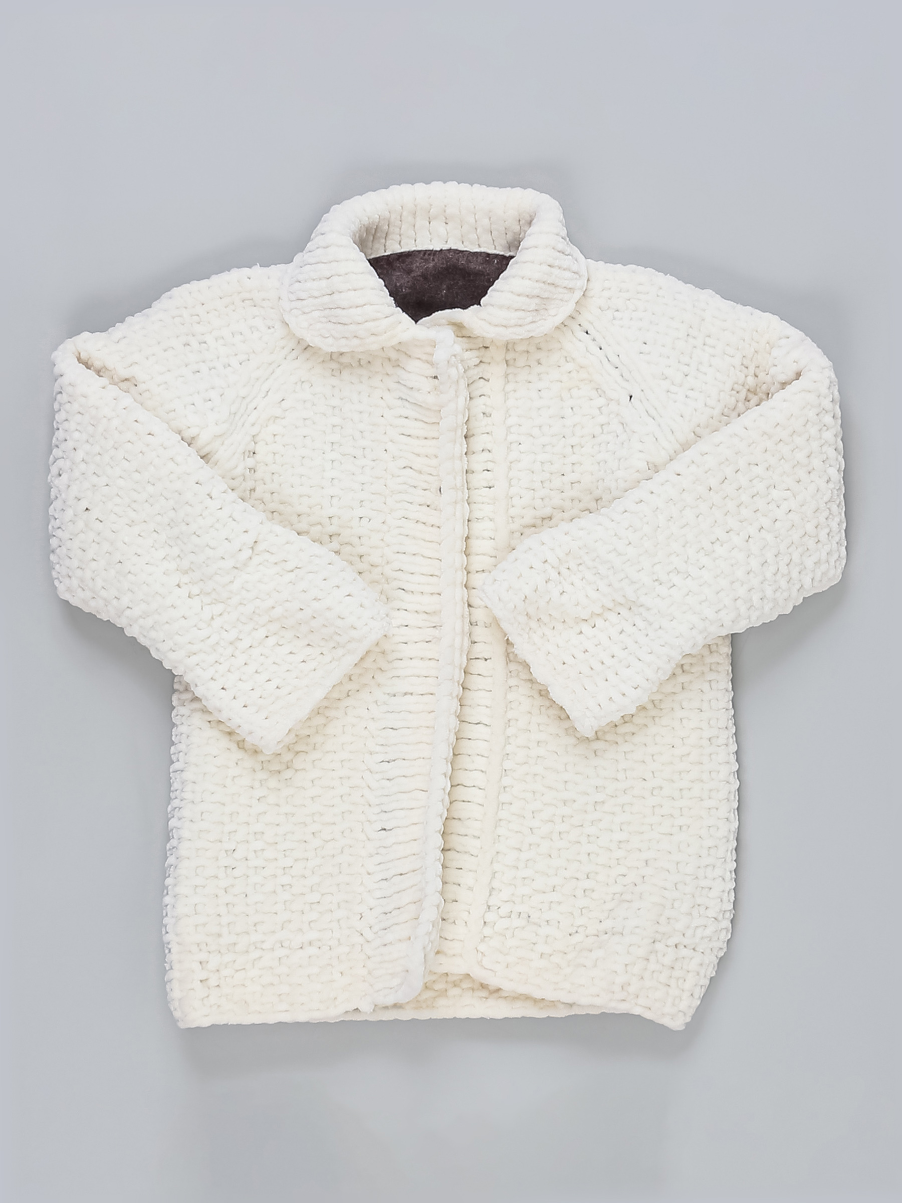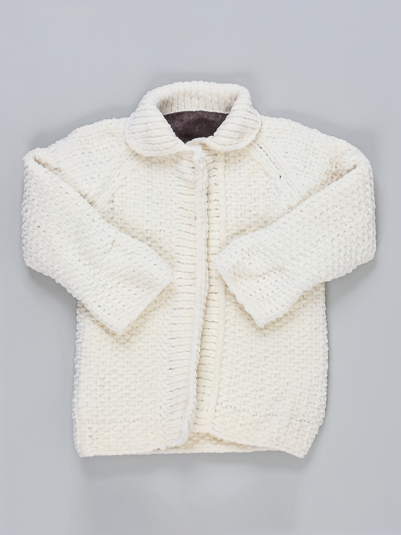 Маркировка на изделии отсутствует. Возраст указан на основании замеров. Цвет молочный. Пришита подкладка самостоятельно, есть катышки.