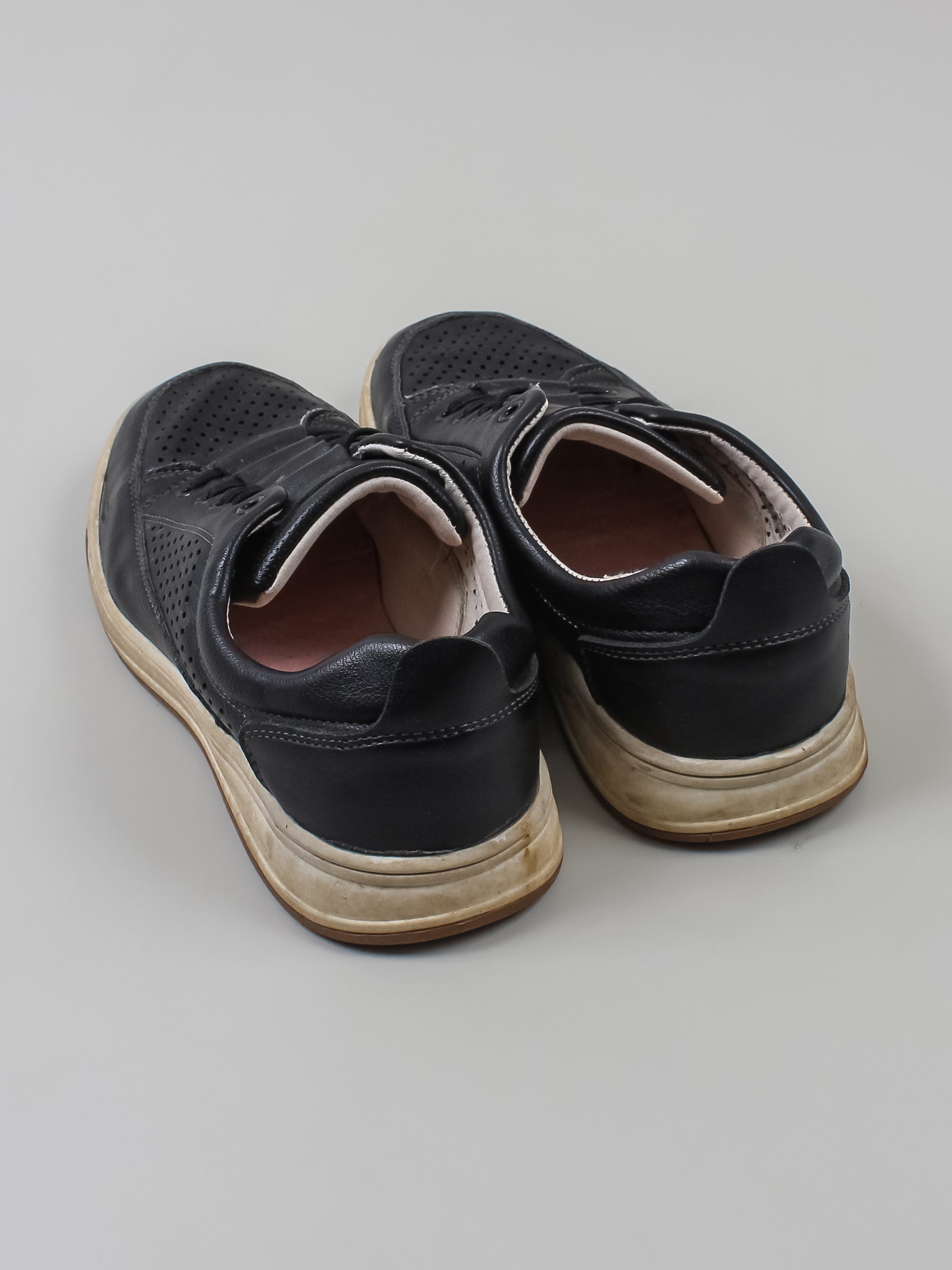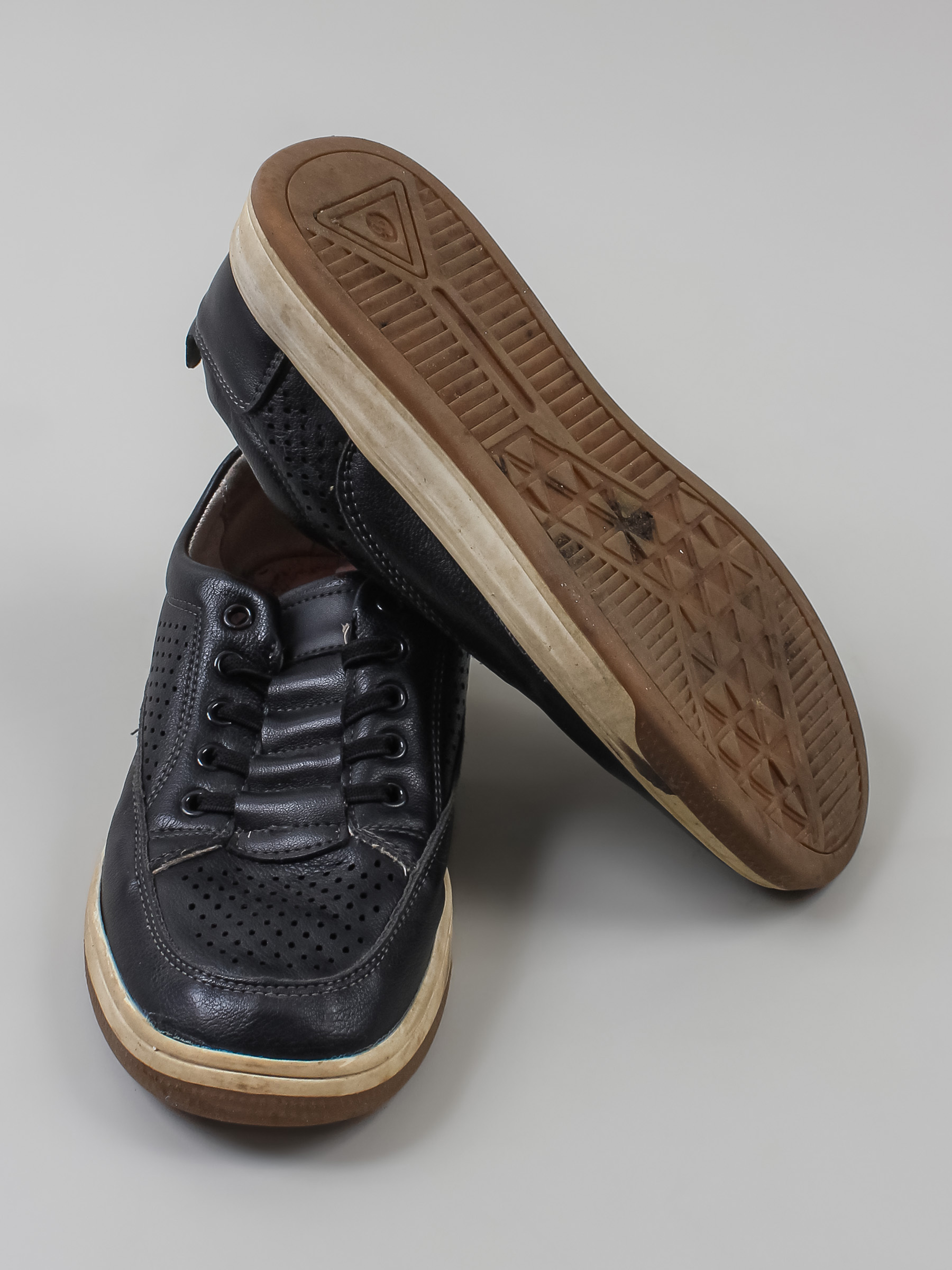 Есть заломы, загрязнения, царапины и потертости. Стельки отсутствуют.
