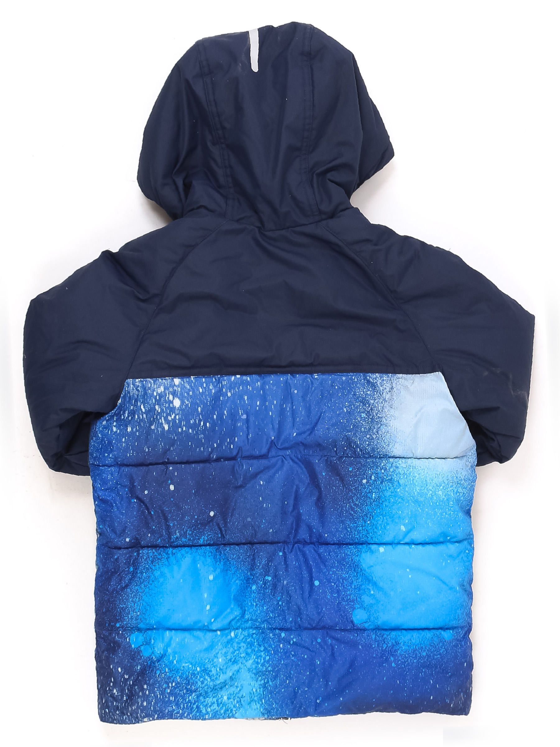 Есть катышки на подкладе, на манжетах. Загрязнения, ткань местами лоснится. Немного сбился наполнитель.