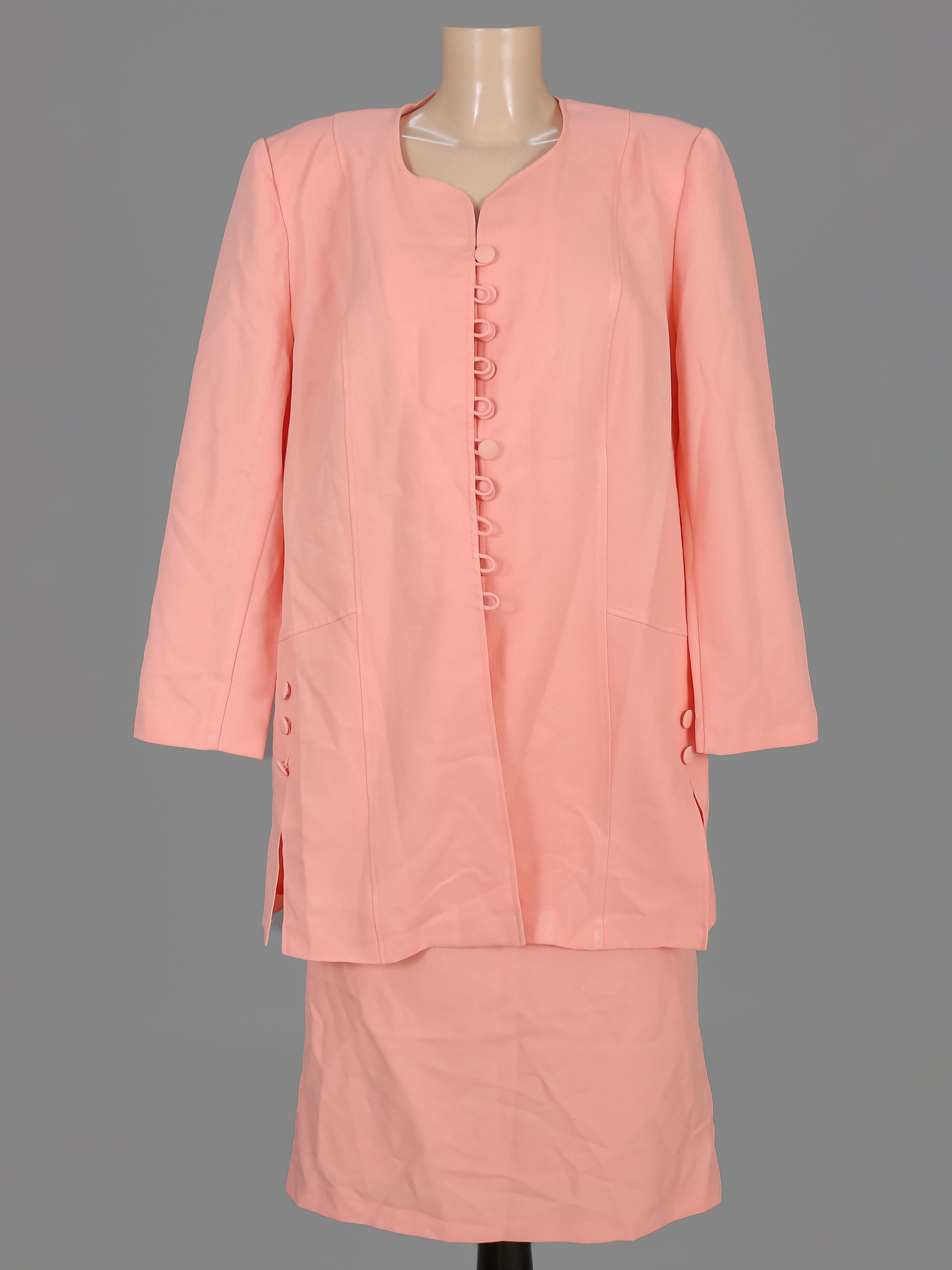 Маркировка 56. Есть немного катышек, пятнышки, на юбке лоснящиеся полосы. Нет пуговицы.