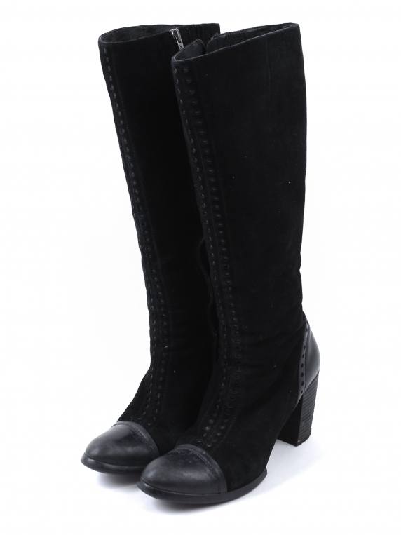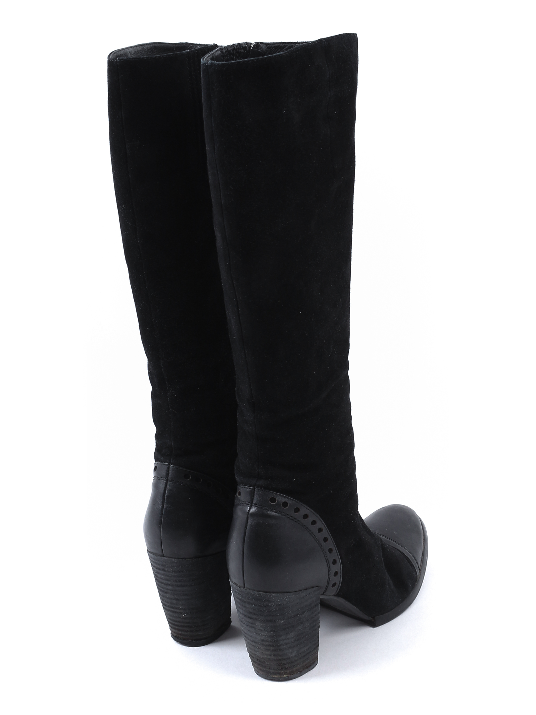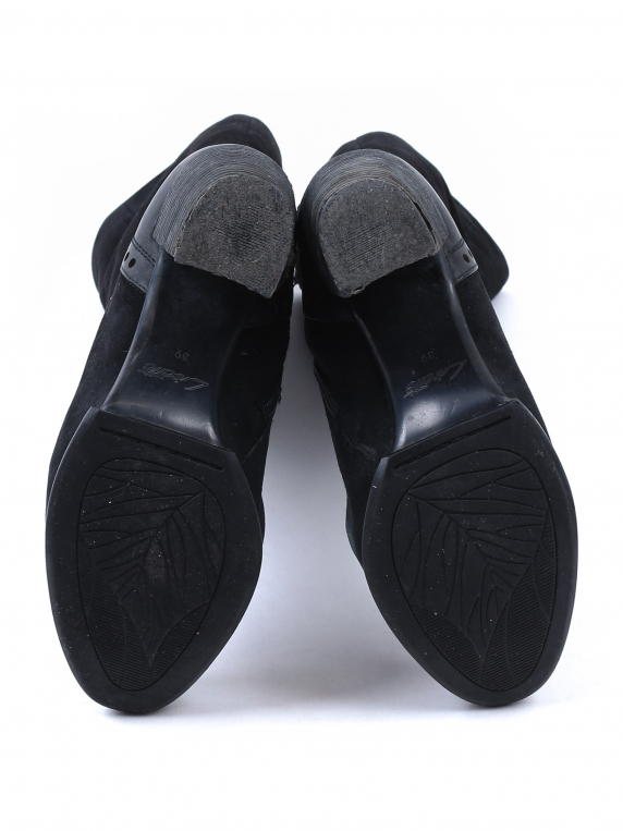 Длина по внутренней стельке указана с учетом носка. Есть загрязнения, заломы, потертости материала, на каблуках отклеивается покрытие.