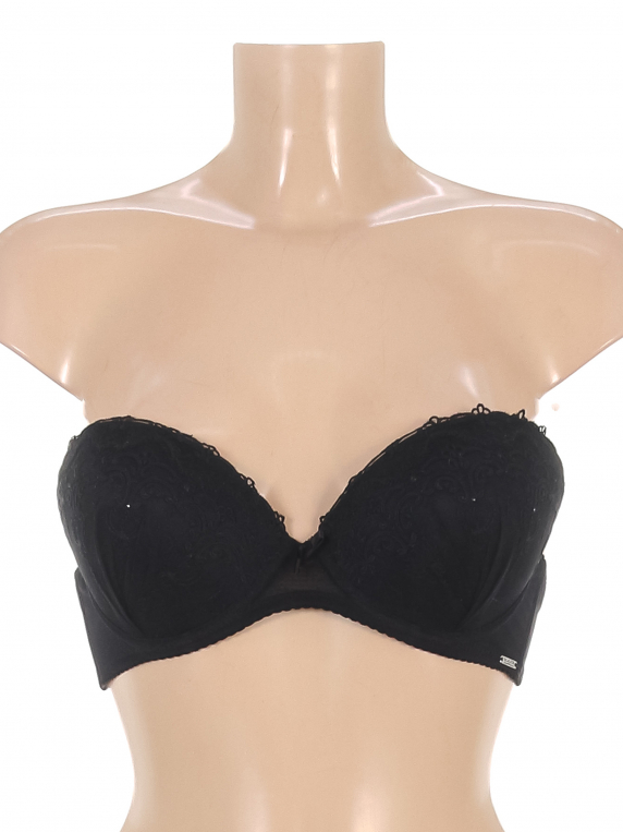 Маркировка на изделии отсутствует. Размер указан предположительно. Пуш ап. Нет бретелей. Есть катышки.