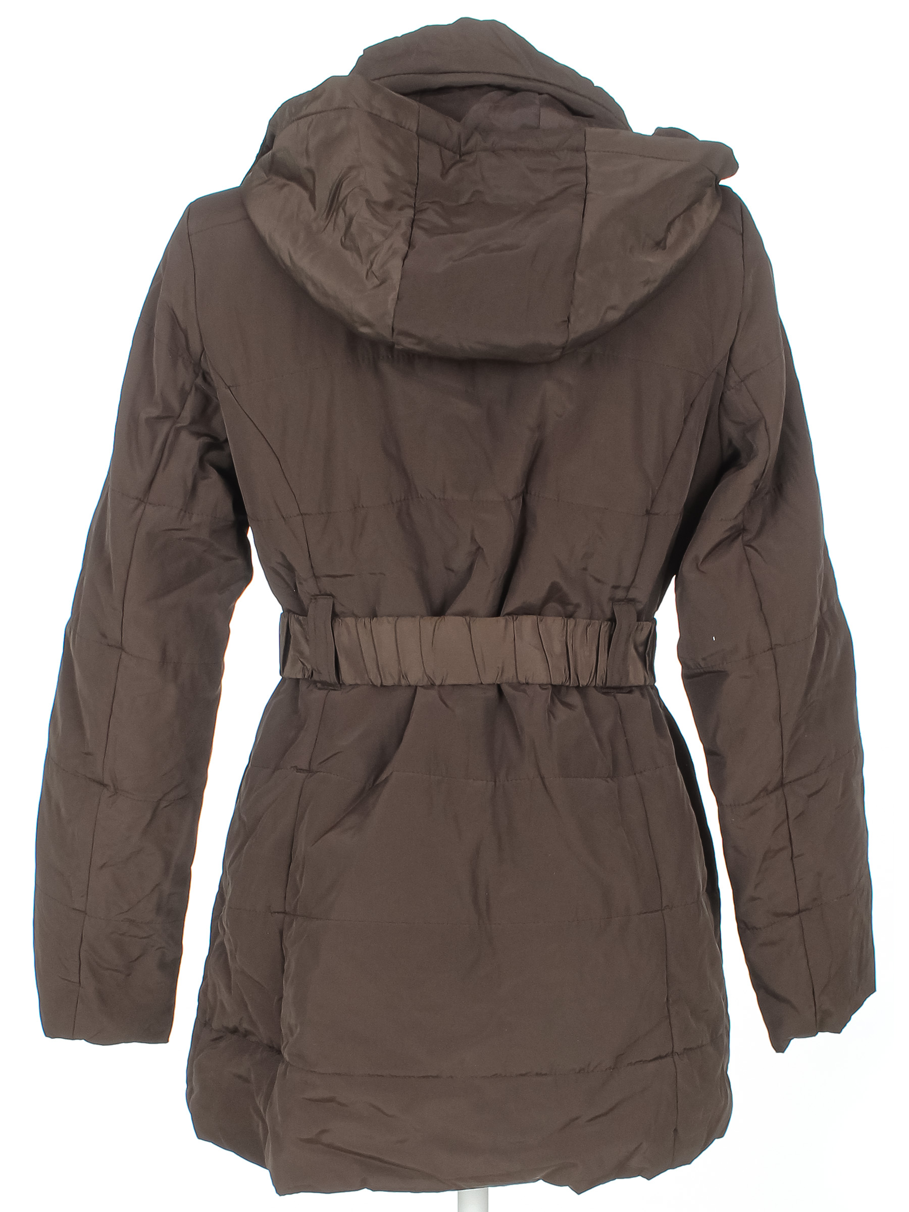 Есть загрязнения, ткань лоснится, сбился наполнитель. На рукаве распускается строчка по шву.
