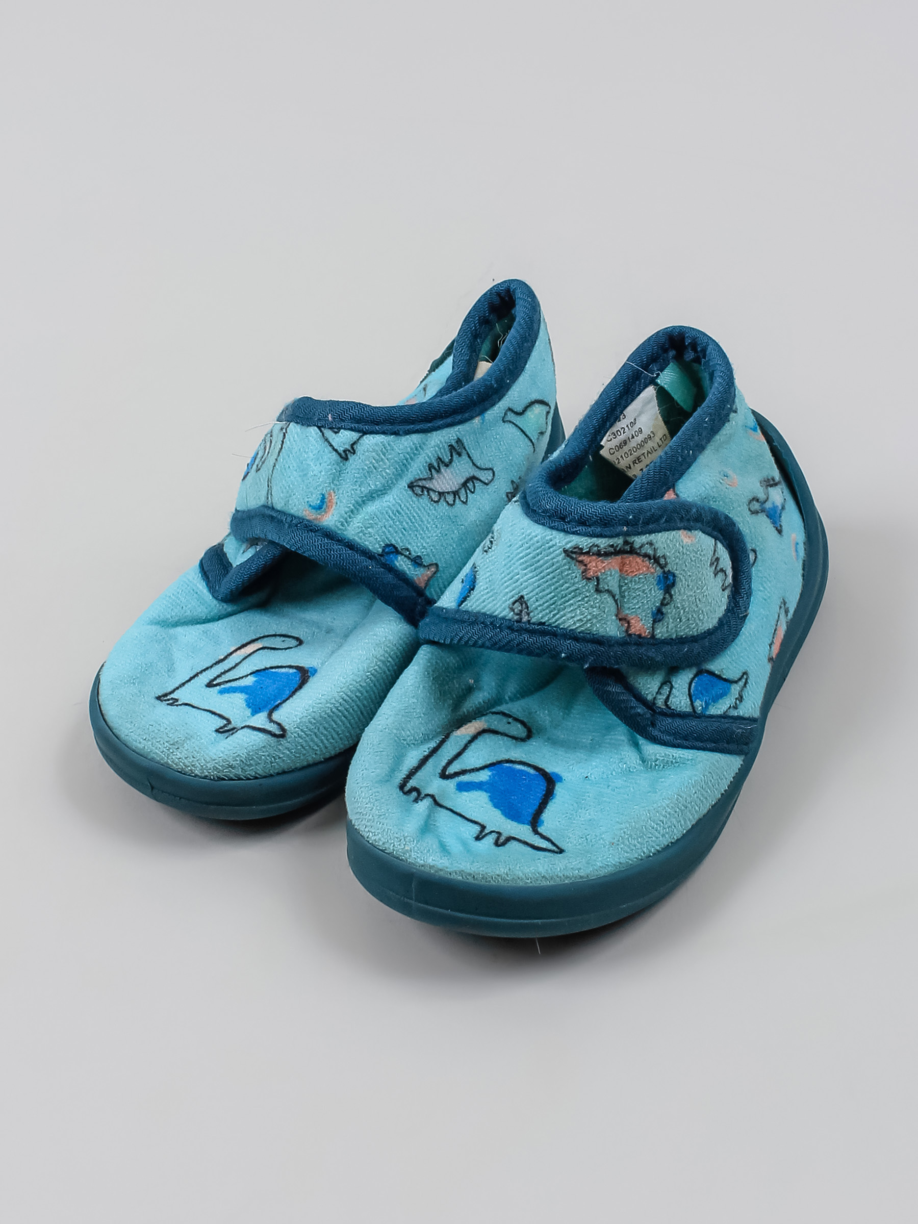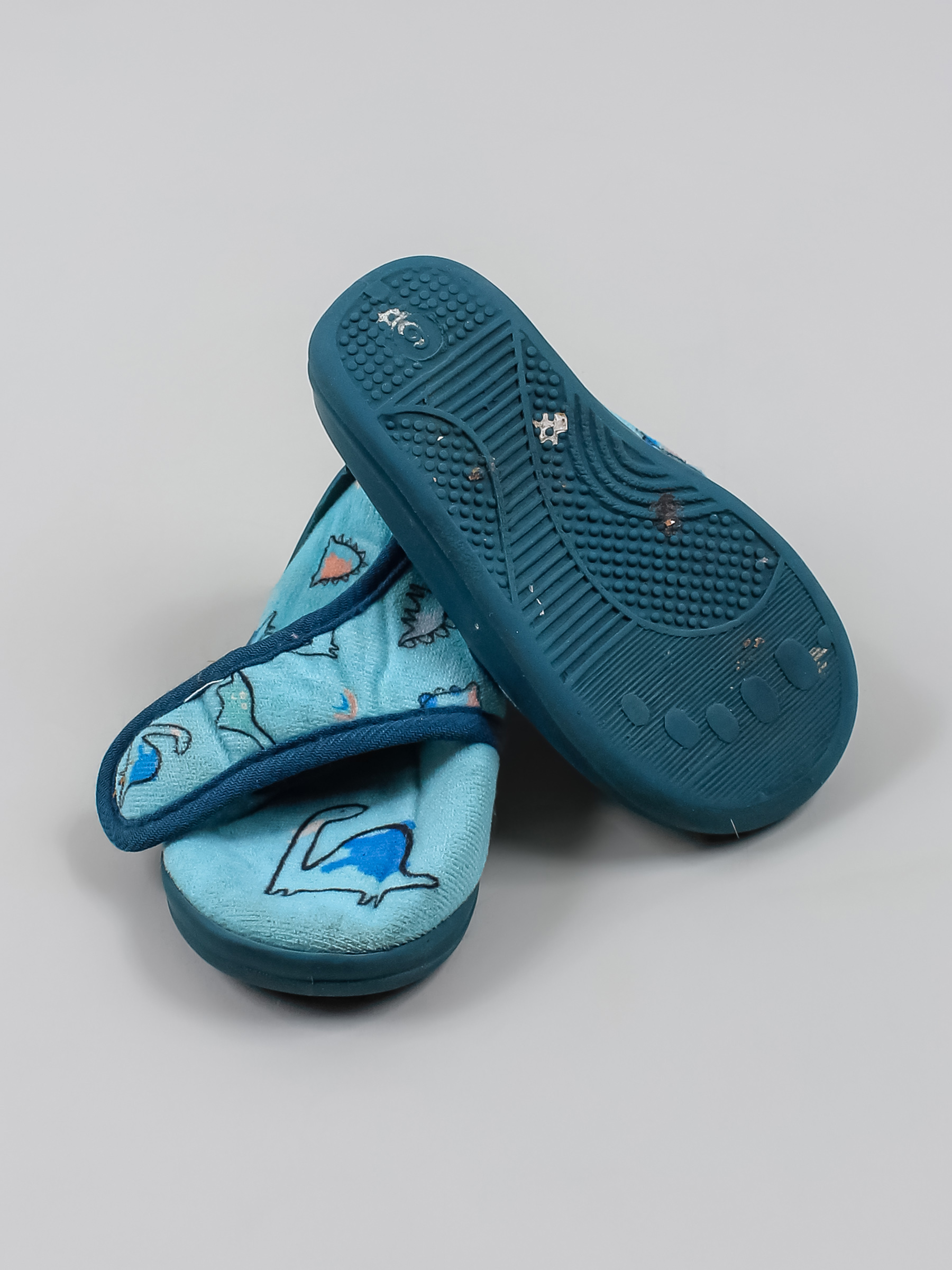 Маркировка на изделии отсутствует. Размер указан на основании замеров. Есть загрязнения и катышки. Липучки требуется заменить. Подошва отклеивается по краям. Стельки отсутствуют.