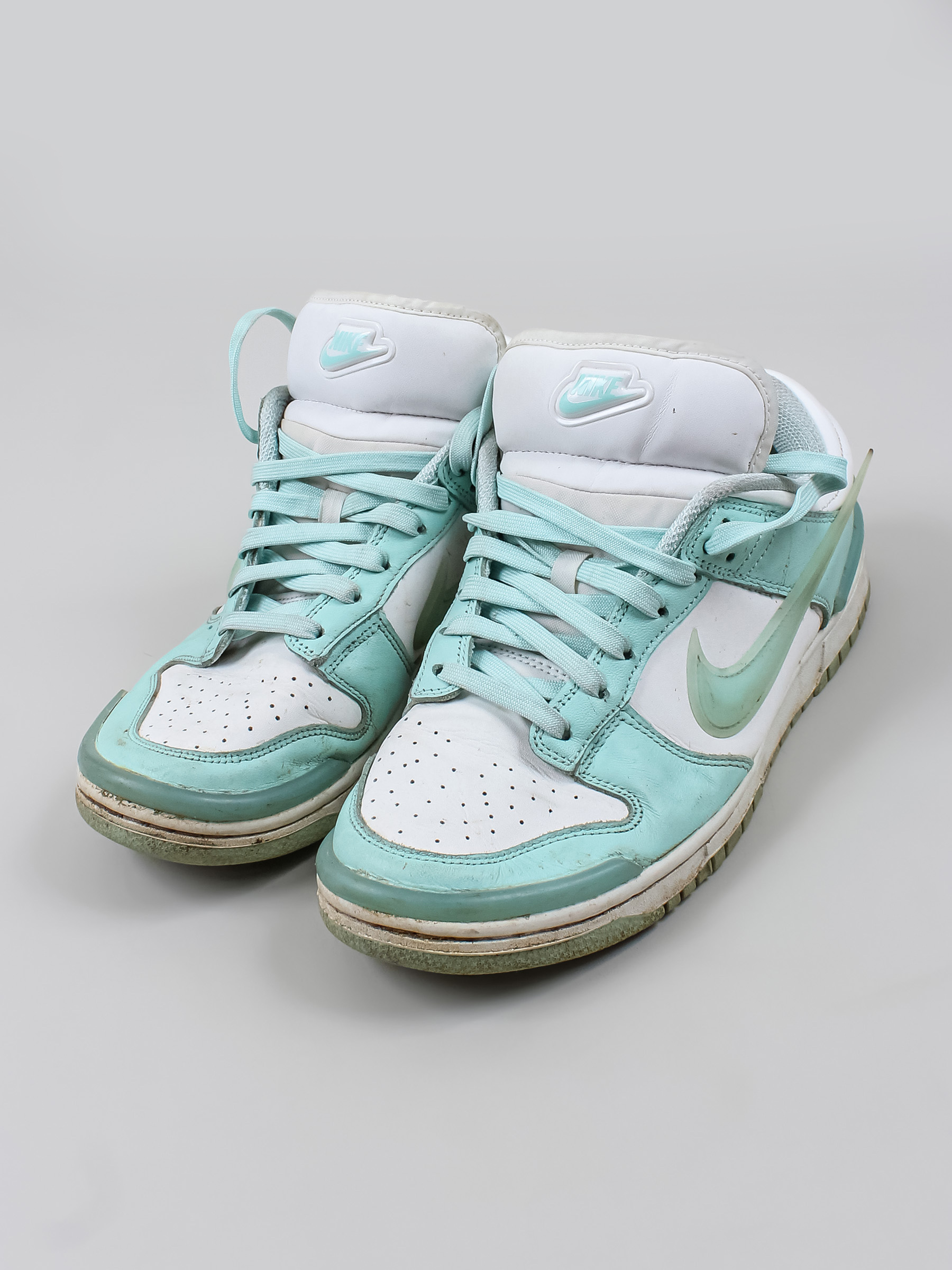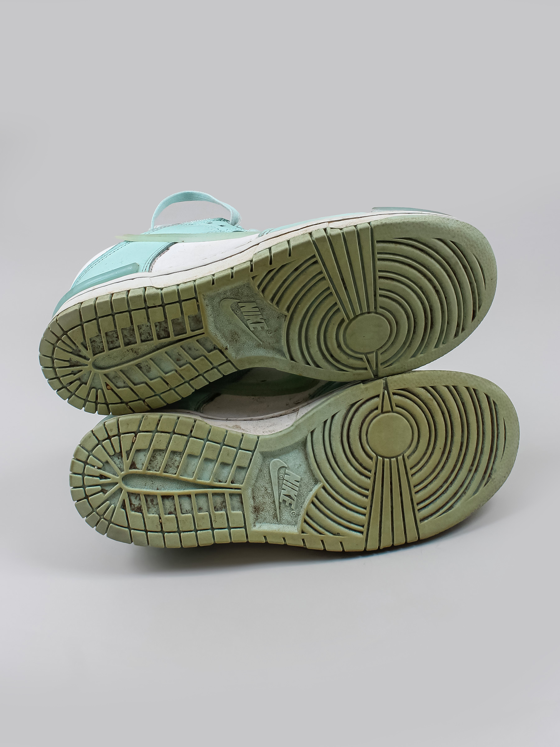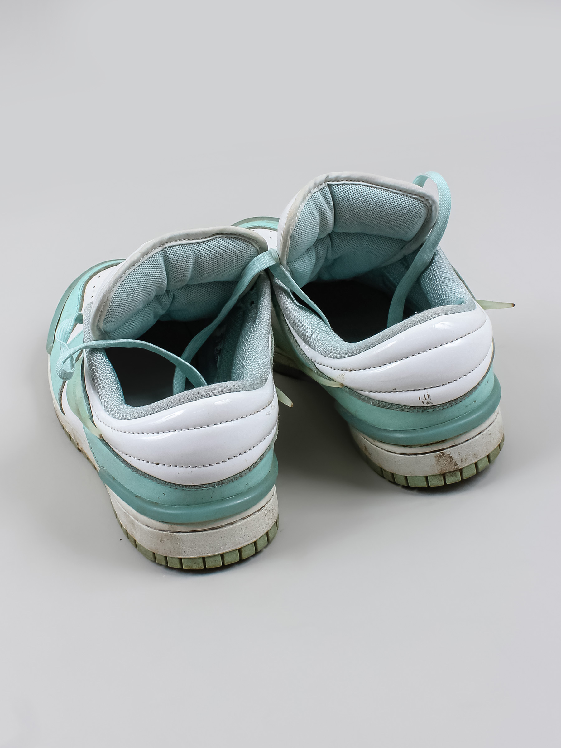 Есть загрязнения, заломы, царапины и потертости. С внутренней стороны протерта ткань у пятки.