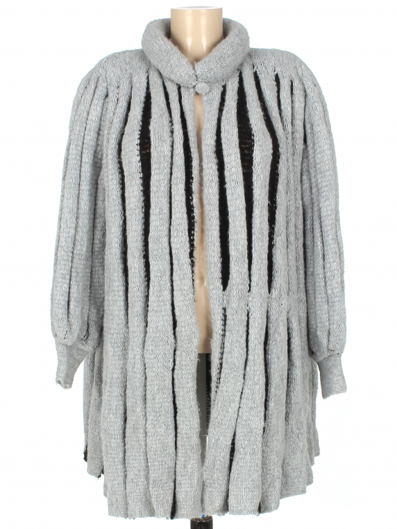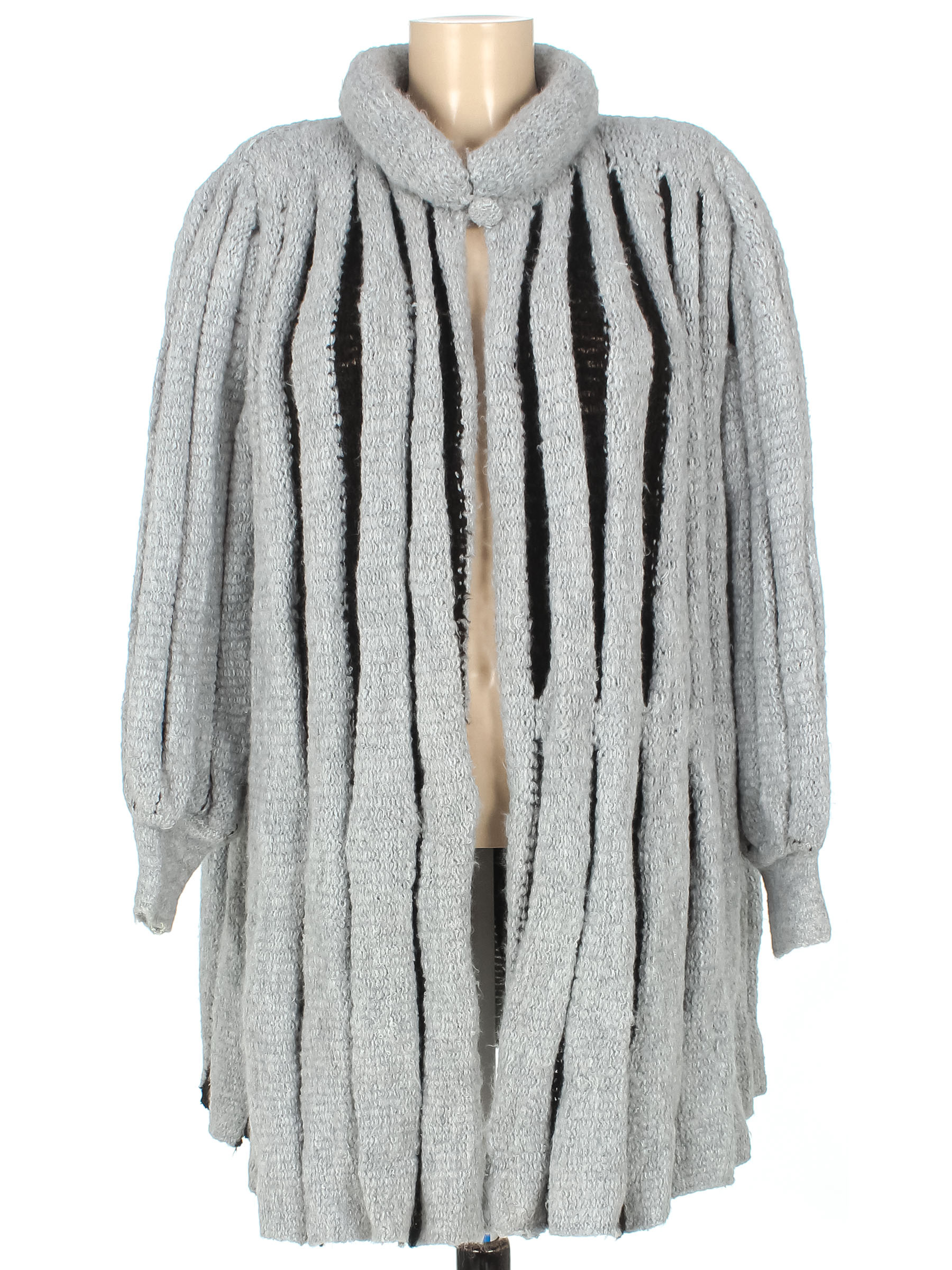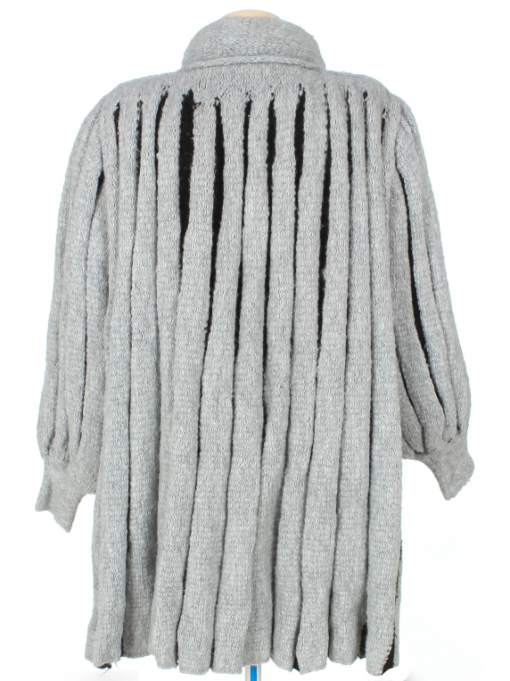 Маркировка на изделии отсутствует. Размер указан примерно 46-48. Свободный крой. Есть катышки, небольшие загрязнения, несколько затяжек, скатался ворс.