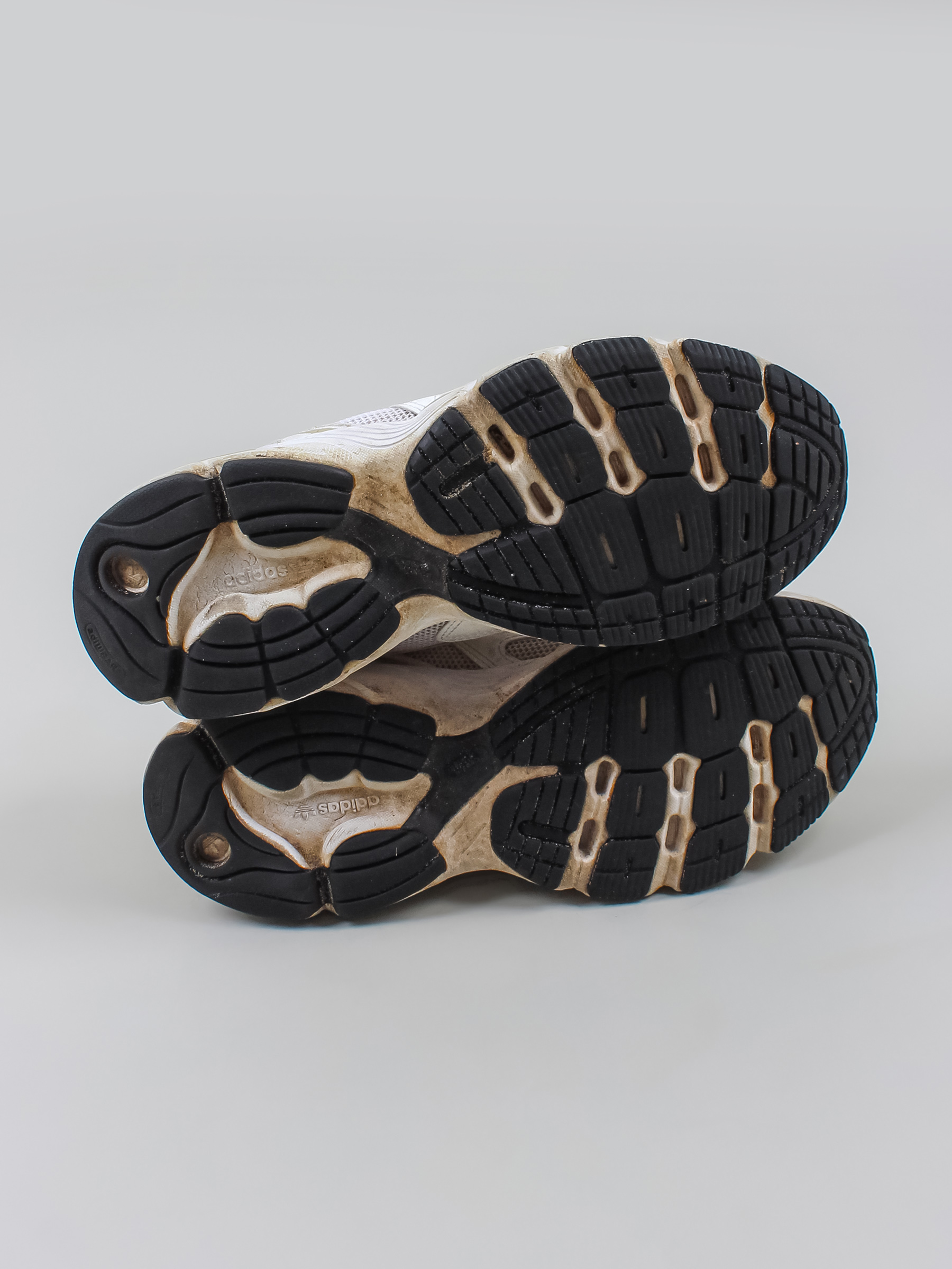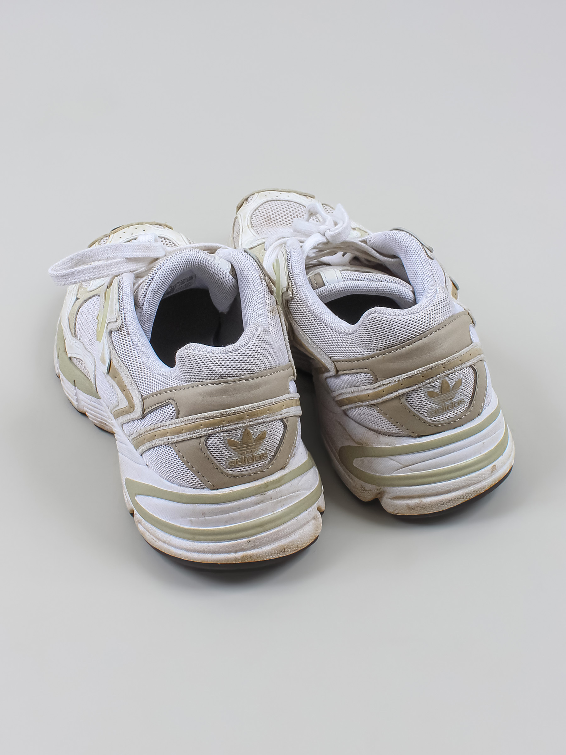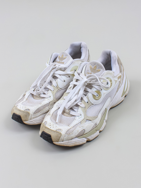 Есть загрязнения, заломы, потертости и катышки на шнурках. С внутренней стороны есть дырочка на пятке.