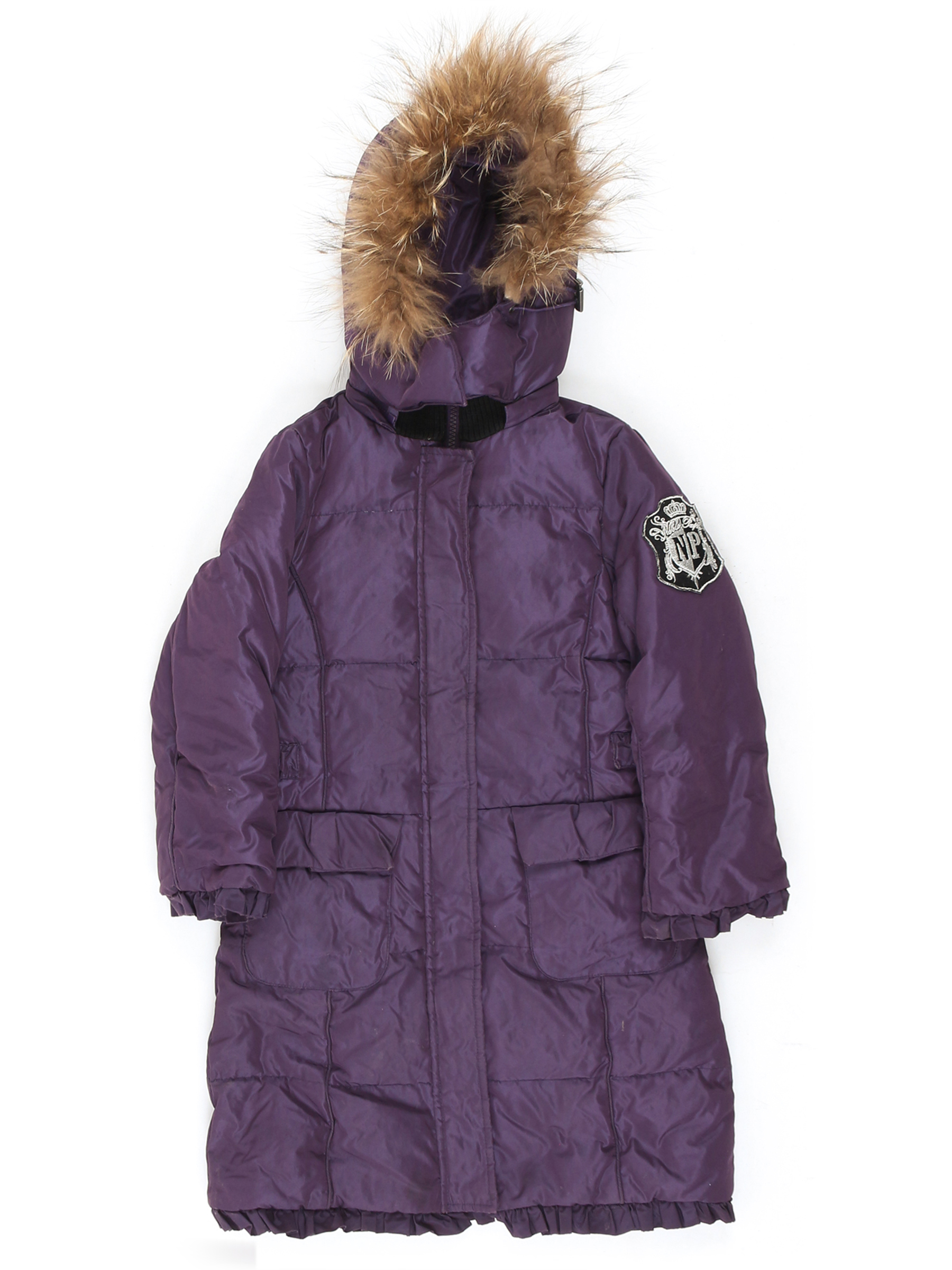 Есть небольшие загрязнения (возможно отстираются). Резинки на капюшоне растянуты. Мех немного скатался.