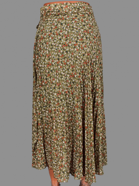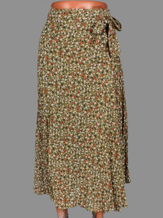 Маркировка на изделии отсутствует. Размер указан примерно 42-44. Есть подъюбник, на нем по низу распускается строчка по шву, несколько мелких затяжек. Юбка на запахе.