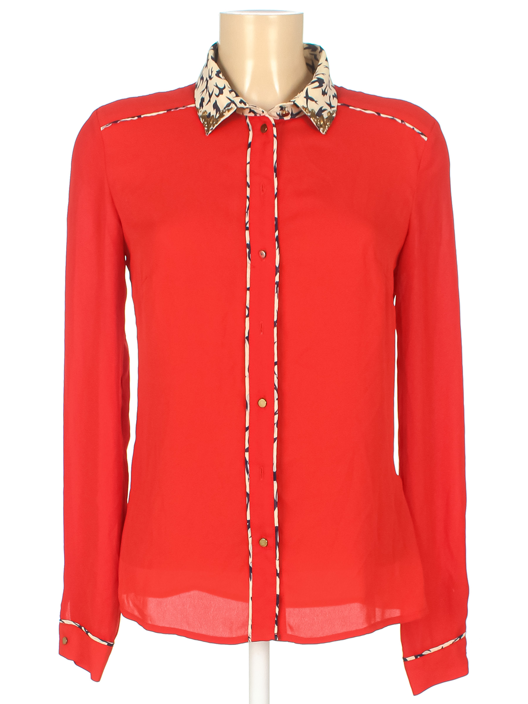 Есть затяжки, стирается покрытие на пуговицах, небольшие загрязнения на воротнике. Нет одной пуговицы.